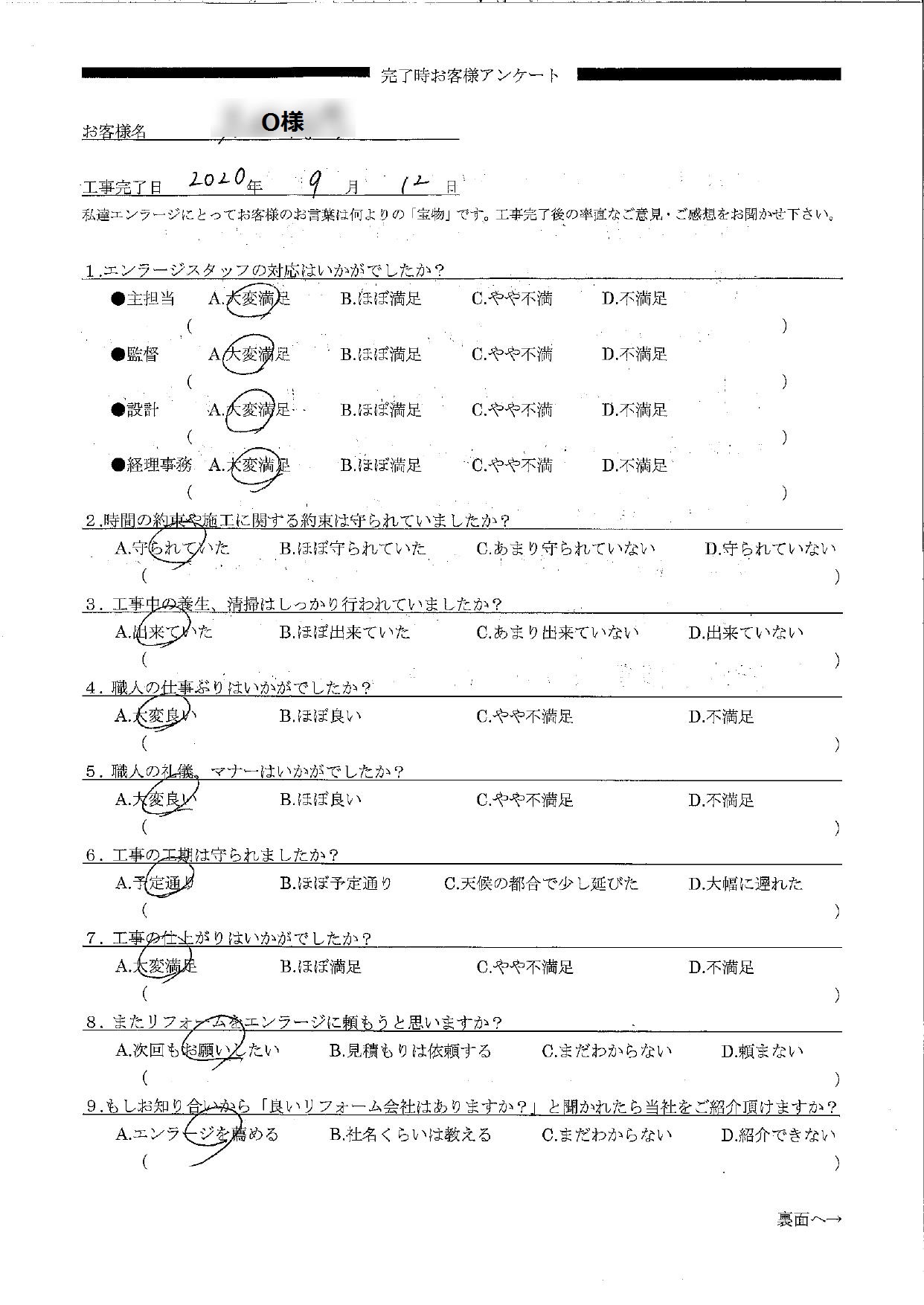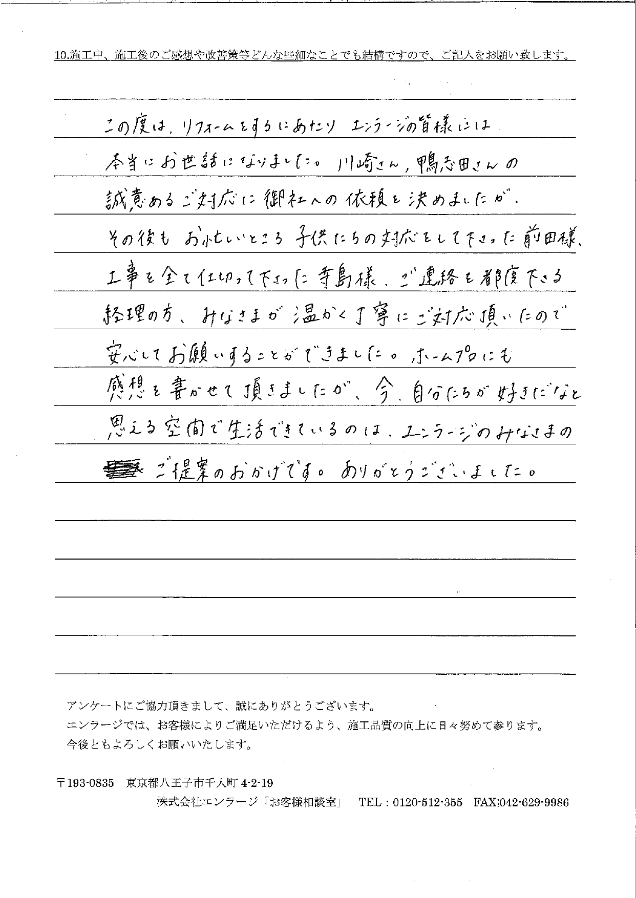 O様 この度は中古購入された大切なご新居の工事をお任せ頂き、誠にありがとうございます。リフォームサイト『ホームプロ』にも最高評価をして頂きましたが、手書きでのアンケートもお送り頂き、本当に嬉しいです。初めてお会いした際、O様の新居やこれからのお暮らしへの想いを知り、「絶対に素敵なお家にするんだ!」と強く思いました。完工後のお部屋の様子見て「理想の住まいになりました!」と仰ってくださり、本当に嬉しかったです。家具や照明があると雰囲気が変わりますね。これからますます素敵なお住まいになっていくと思うとワクワクします。今後ともよろしくお願い致します。日野支店 川崎・鴨志田