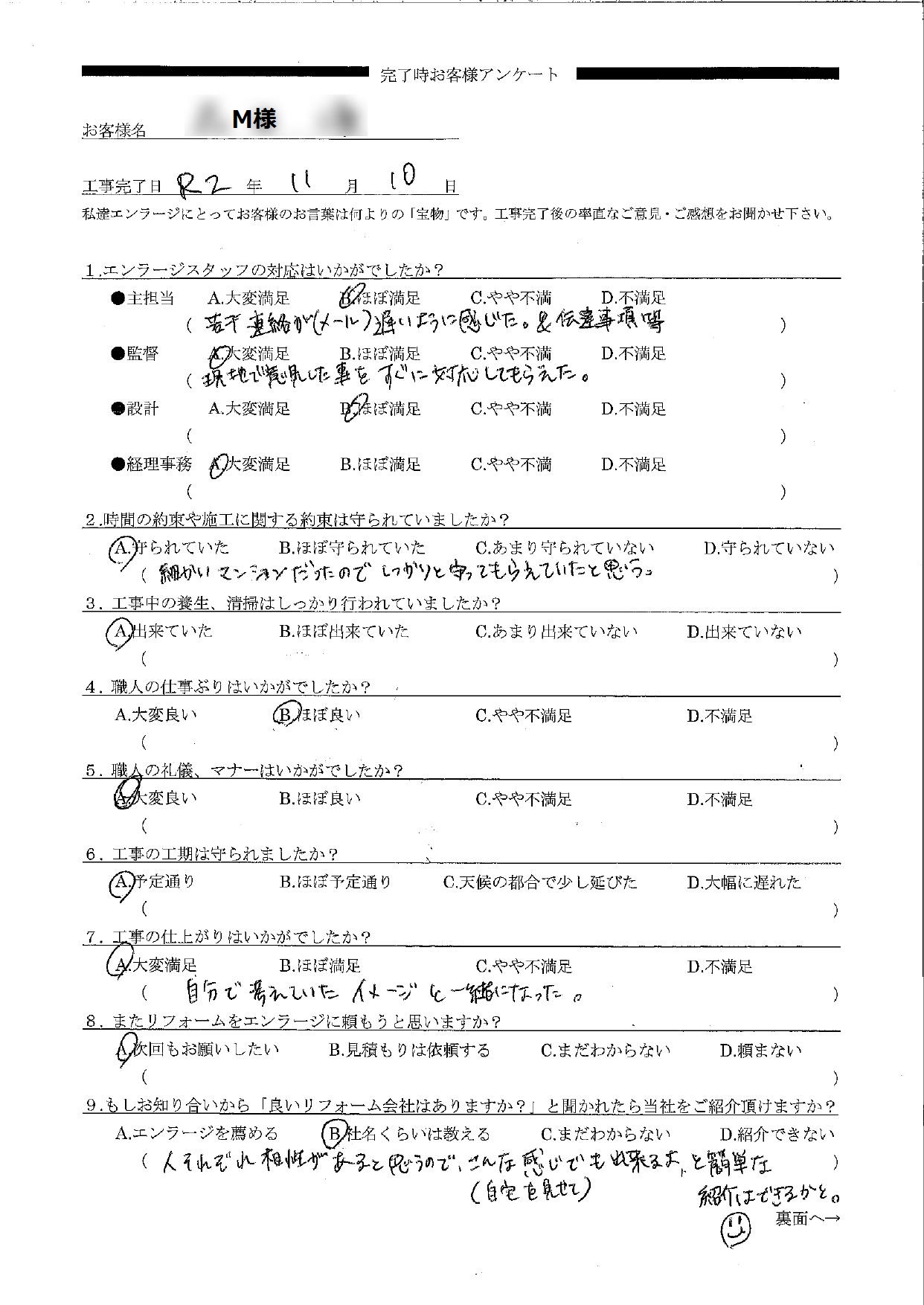 K様 この度はマンションのほぼ全面リフォームを当社にお任せ頂き、ありがとうございました。K様の奥様は当社直営の「カフェエンラージ」スタッフのママ友というご縁でご来店頂いたので、最初からとてもフレンドリーに接して頂きました。水廻りのほぼ全部の交換と内装工事でしたが、住みながらの施工でしたので、ご負担は大きかったと思います。できる限り配慮させて頂きましたが、「大変満足」のお声を頂き、とても嬉しいです。また時々カフェエンラージにもお立ち寄りください。