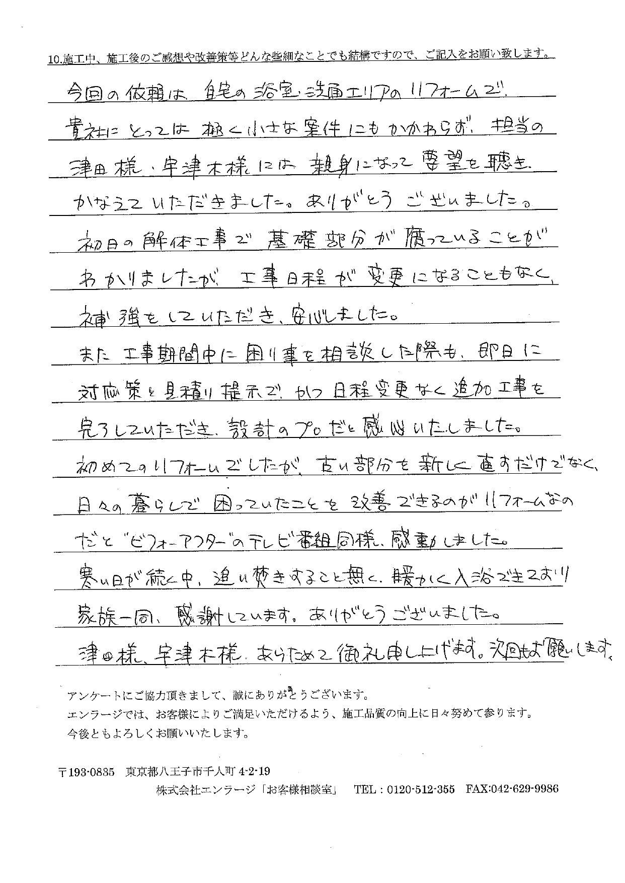 S様、この度はお風呂と洗面室のリフォームをお任せいただきありがとうございました。浴室の解体直後は、土台の腐食などが発見されて不安を感じられたかと思いますが、今後は安心してお暮らし頂けるようしっかりと補修をさせていただきました。『設備を交換するだけでなく、不安や不便な点を解消することがリフォームなんですね』とおっしゃっていただけたことは、お客様の気持ちに寄り添った結果が報われたようでとても嬉しく感じました。次回はLDKのリフォームもご検討されるとのことですので、その際にはまたよろしくお願いいたします。プランナー 津田