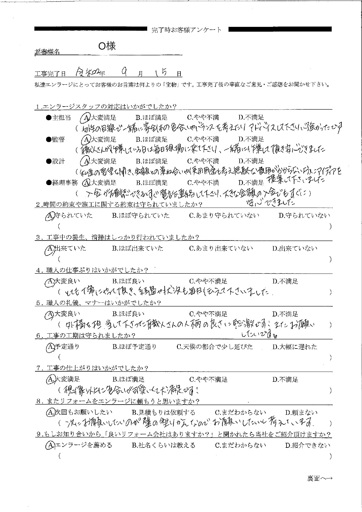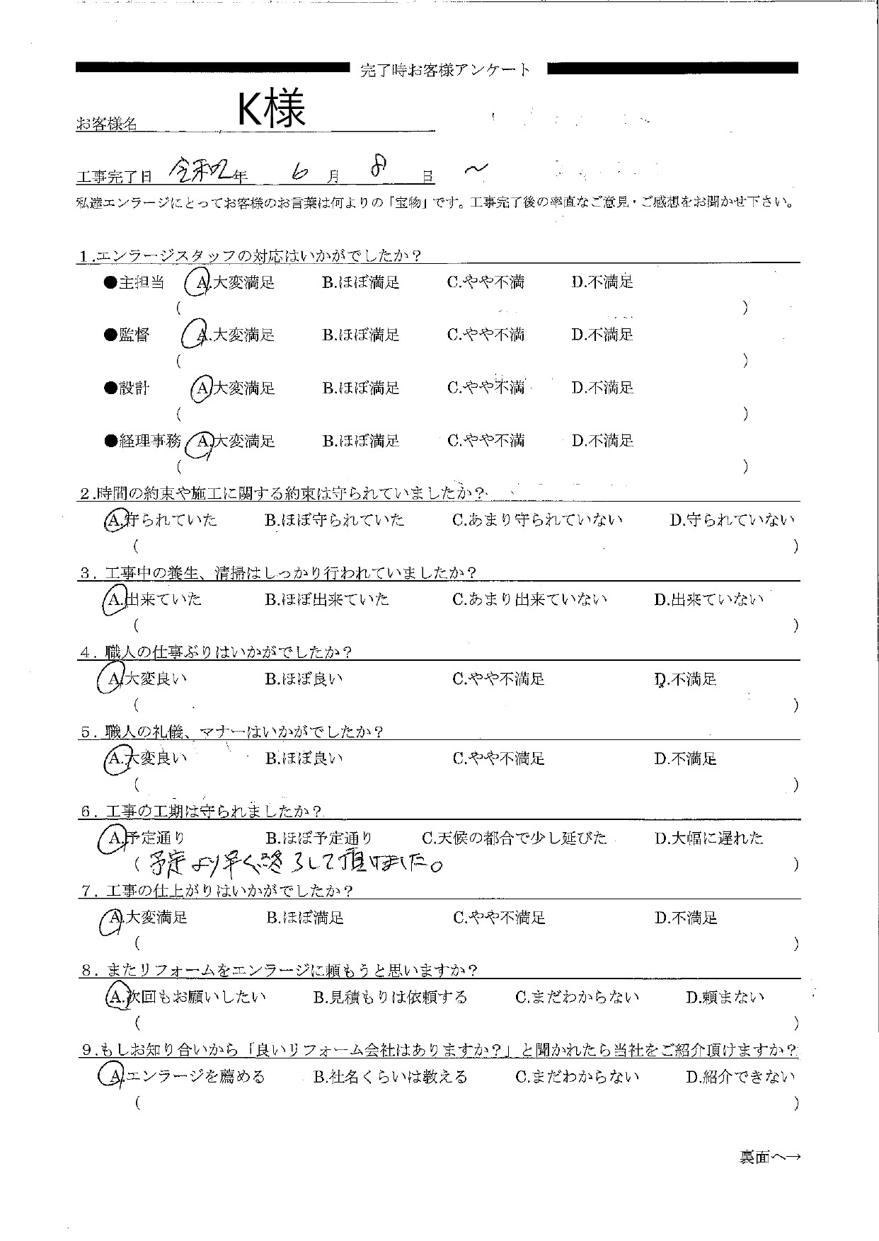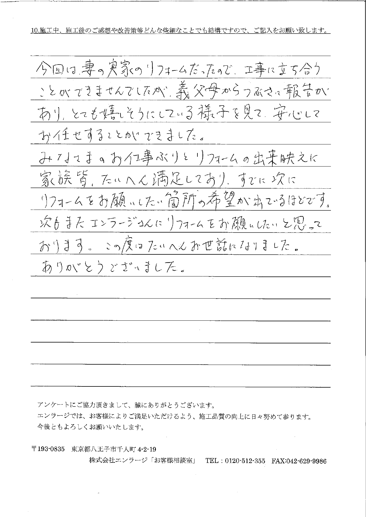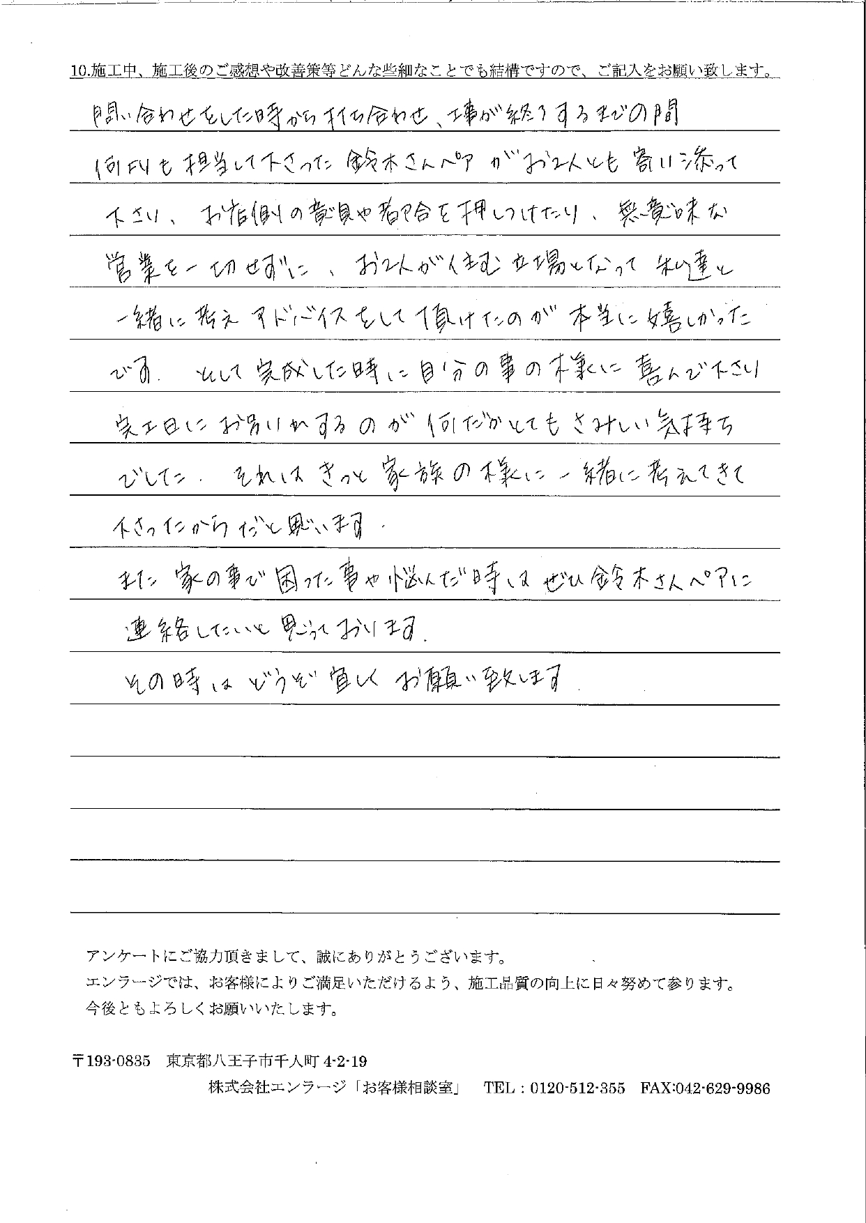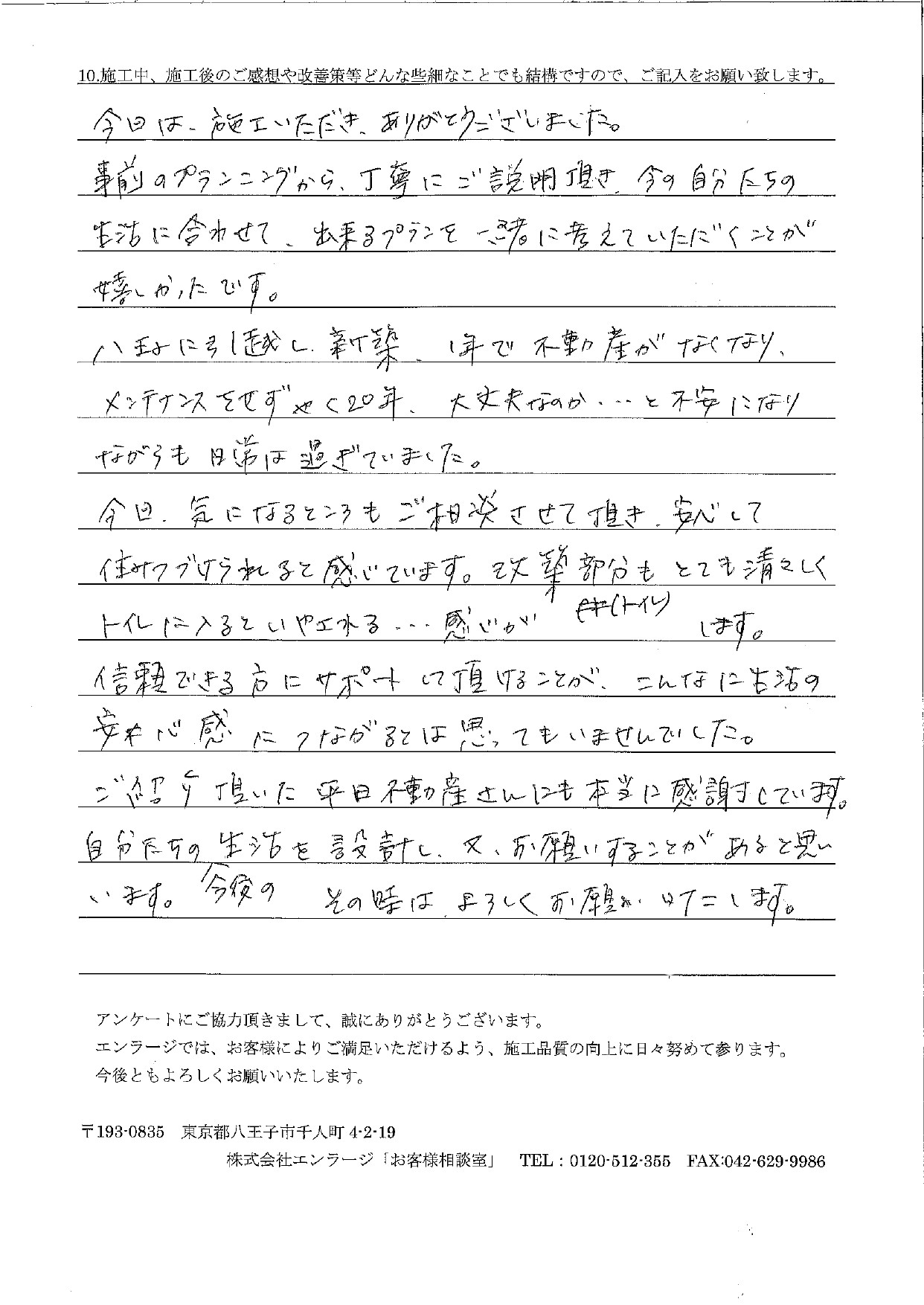 K様へ この度はご用命頂きありがとうございました。同じ西八王子地区の不動産会社さんからのご紹介だったので、施工には万全の態勢で臨みました。お喜び頂けて本当に良かったです。二期工事の増築の際にもご満足頂けるよう頑張ります。 八王子店 石井