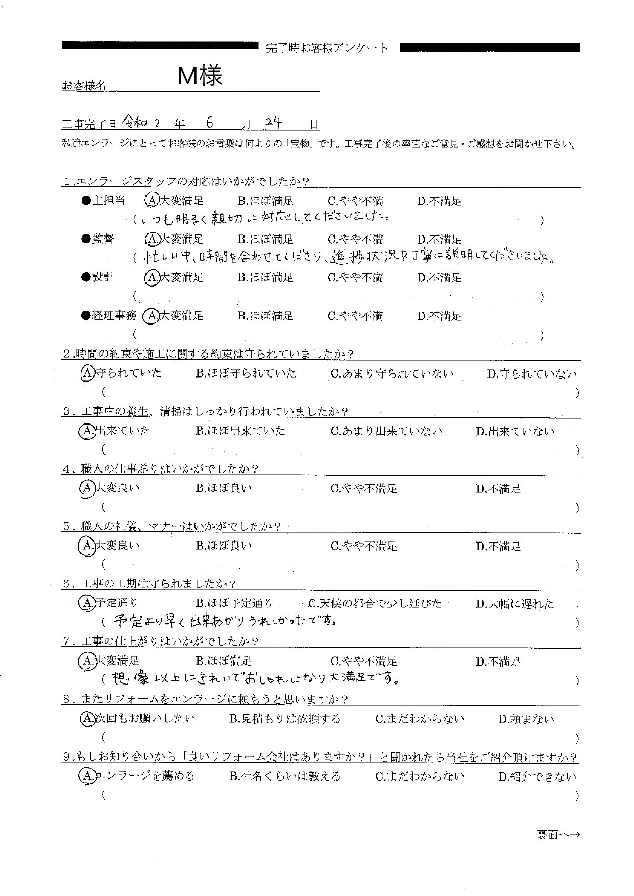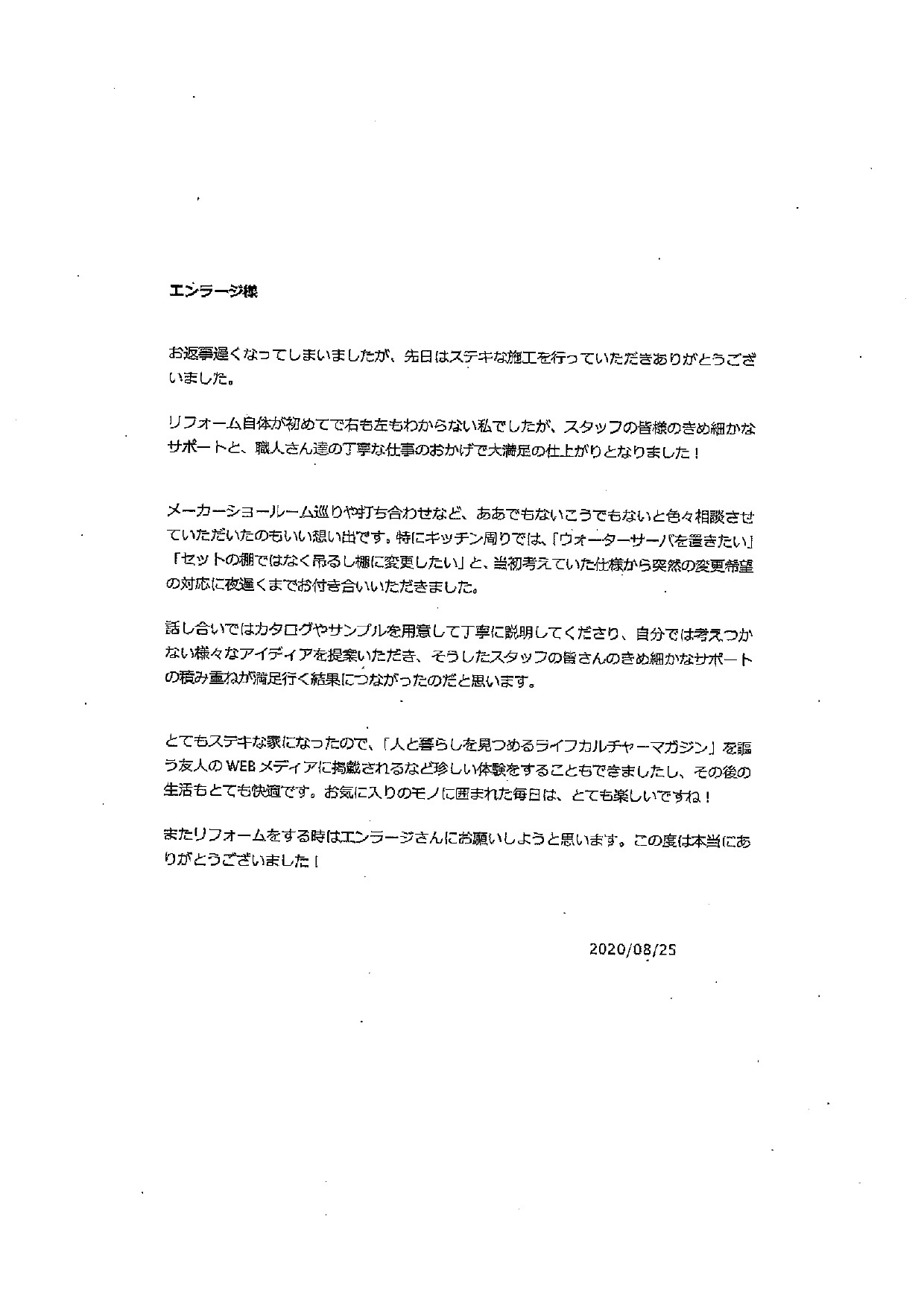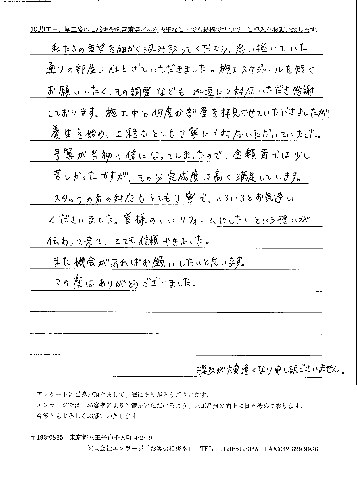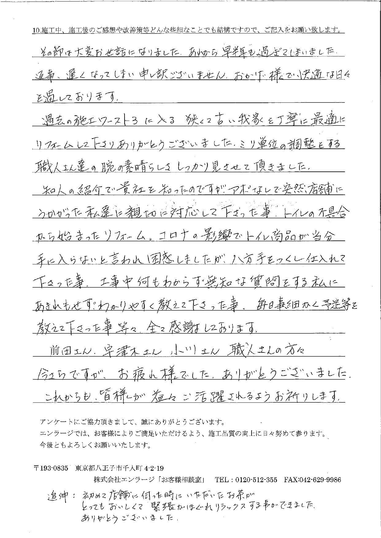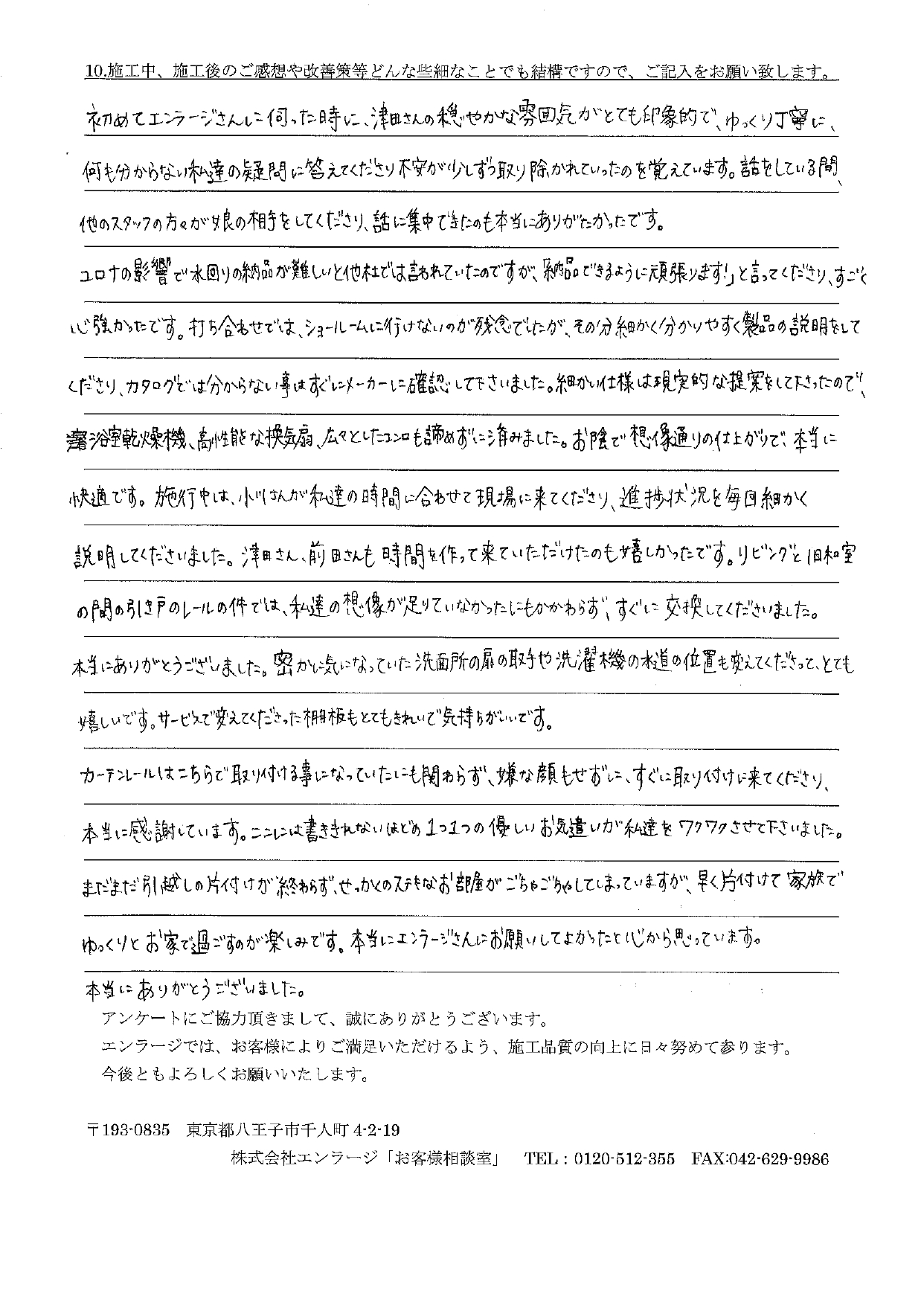 M様 この度はマンション全面リフォームの工事をご依頼頂きありがとうございました。コロナ禍での工事でしたので、感染の予防には十分に配慮させて頂きました。予定工期内に完成し、仕上がりにもご満足頂けてとても嬉しいです。長文のお手紙を頂き感動いたしました。これからも宜しくお願い致します。 八王子店 津田