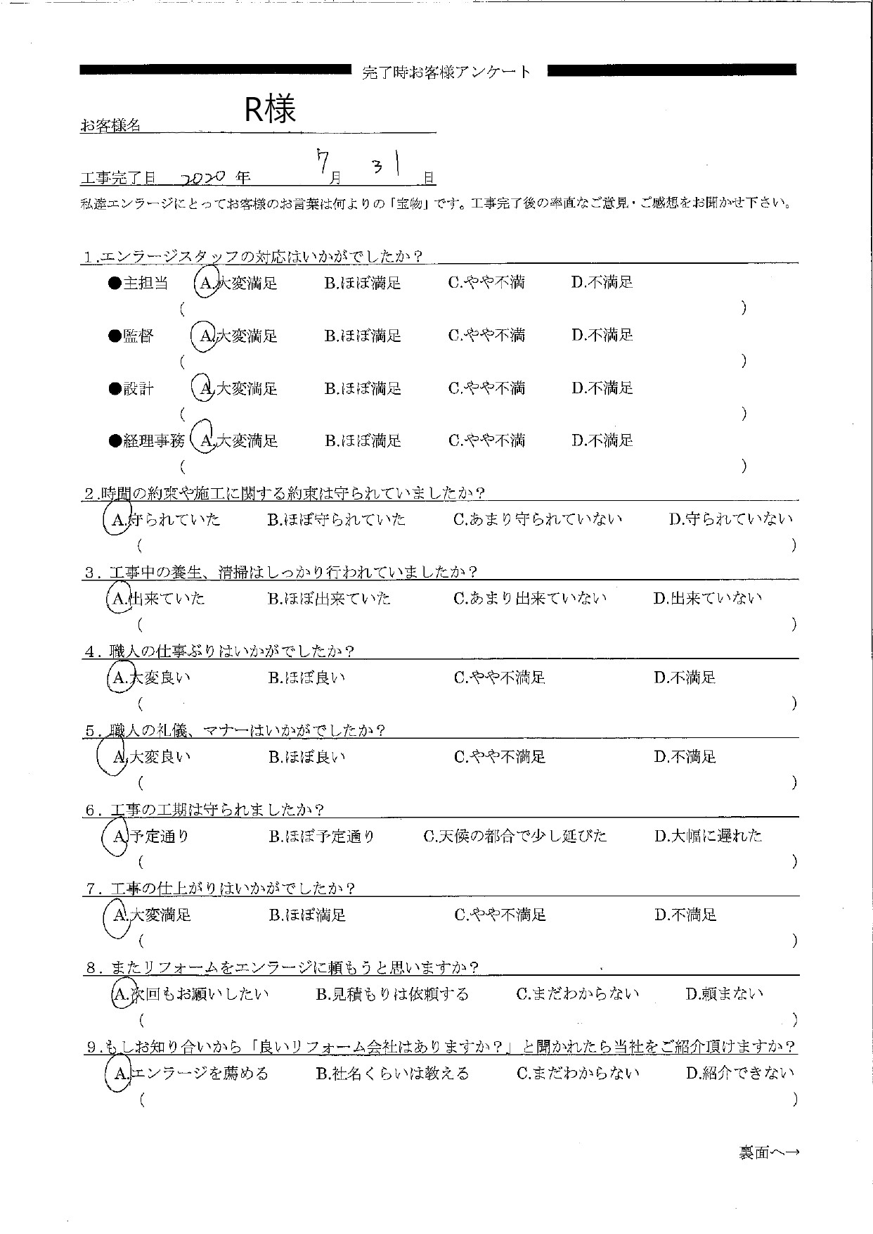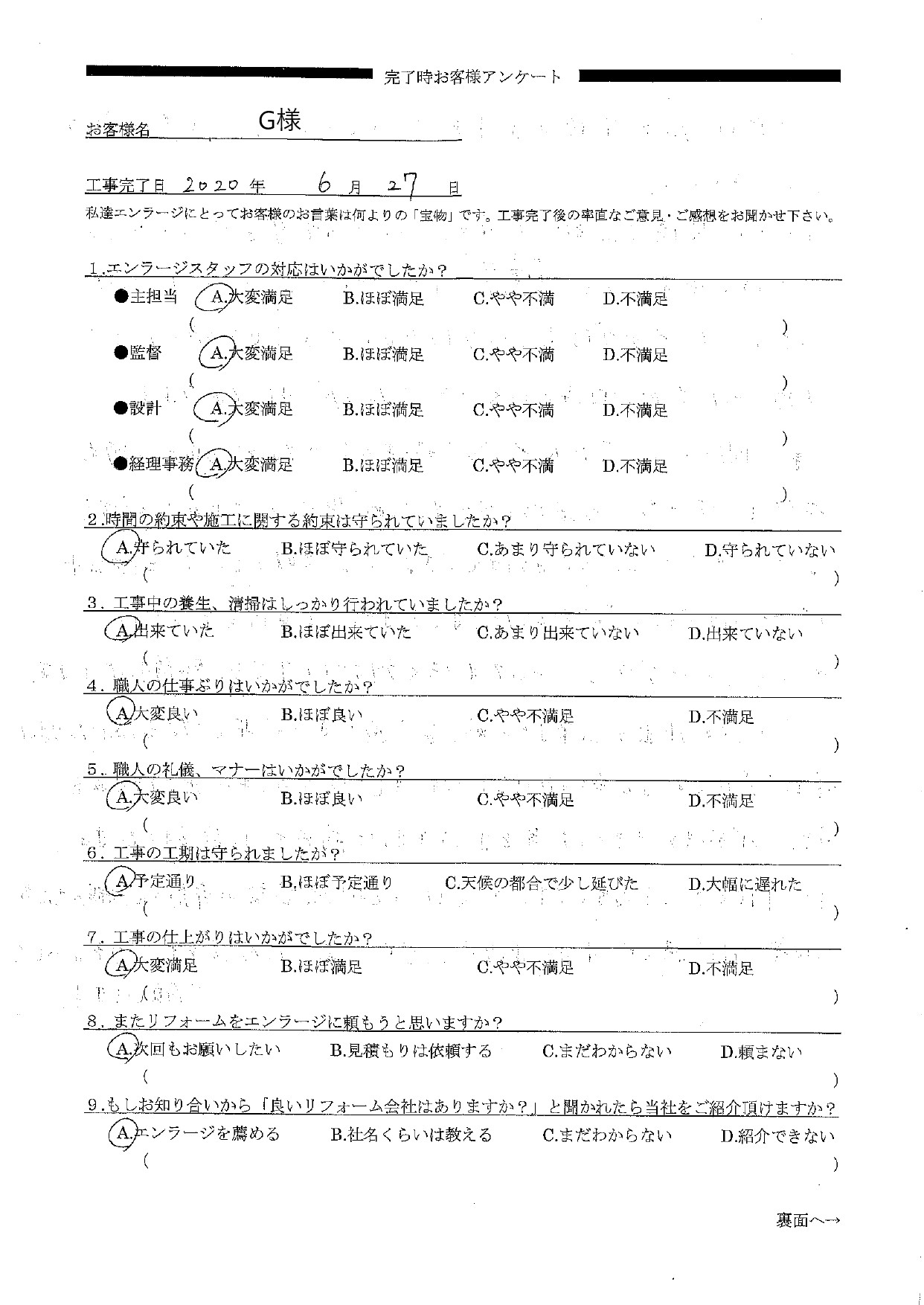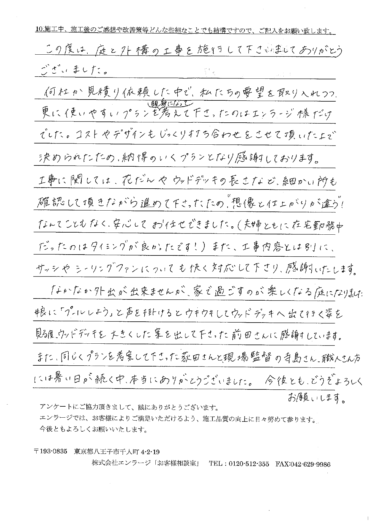 G様 この度は外構のリフォームを当社にお任せ頂きありがとうございました。また「オールA」のお客様アンケートと長文のメッセージを頂き、本当にありがとうございました。G様の有り難いお言葉に感激して、思わず泣いてしまいました。プランニングの際にはお子様が楽しく遊ぶ姿を思い浮かべながら、心を込めてデザインさせて頂きました。その努力が報われて、とても嬉しく、自信にもなりました。G様の事は一生忘れません!これからも宜しくお願い致します。 日野支店 前田