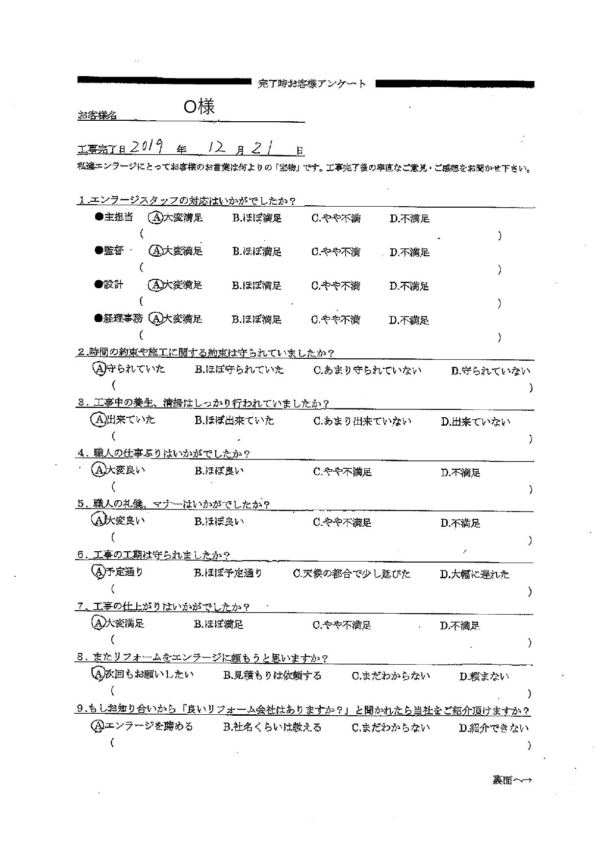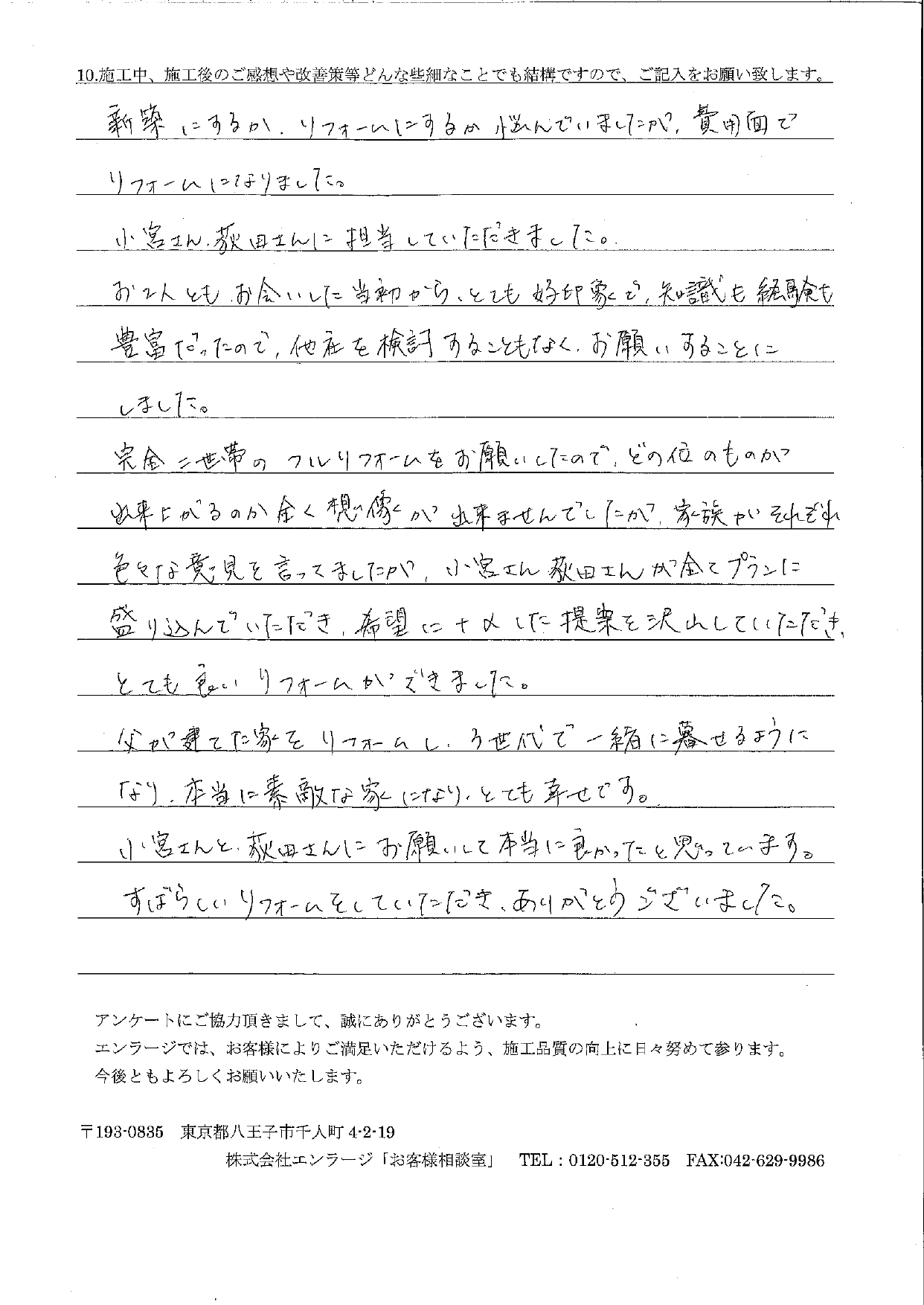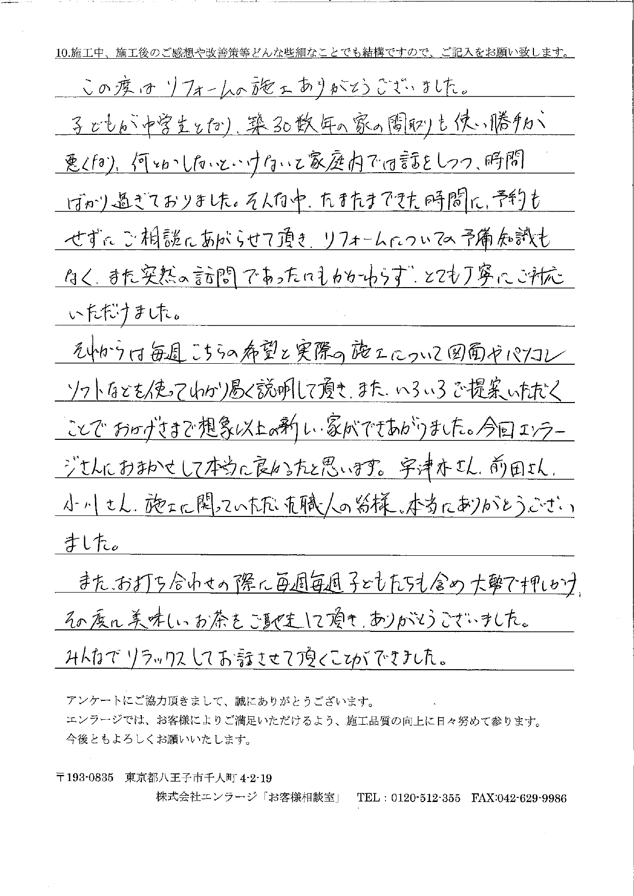 F様 この度は2階全面リフォームの工事をお任せ頂きありがとうございました。F様はご夫婦で八王子市役所にお勤めという事もあり、当社の事は良くご存知でした。初めてのご来店の時からとても好意的で、設計プランとお見積りをご提示した直後にご契約を頂きました。お子様の成長に合わせて間取りを変更したいというご希望だったので、設計の宇津木と協力して一生懸命プランを作らせて頂きました。現場監督の小川もF様に喜んで頂きたいという一心で、現場の指揮を執らせて頂きました。「大変満足」の評価を頂けて本当に嬉しいです。これからも宜しくお願い致します。 プランナー前田