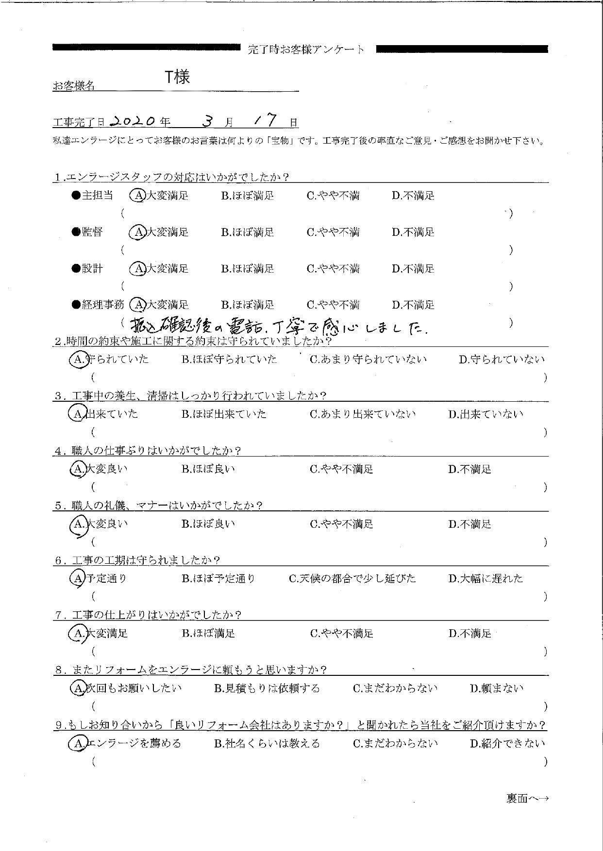 T様へ マンションの水廻り交換と内装工事をお任せ頂きありがとうございました。T様は、当社でリフォームさせて頂いたお客様のご紹介というご縁もあり、絶対にご満足頂きたい!と気合を入れてプランニングさせて頂きました。浴室をサイズアップしたいというご主人様のご希望と、綺麗で使いやすいキッチンにしたいという奥様のご希望の両方を達成できて、本当に良かったです。コロナ禍は続いておりますので、お身体にはくれぐれもお気を付け下さい。これからも宜しくお願い致します。 プランナー前田