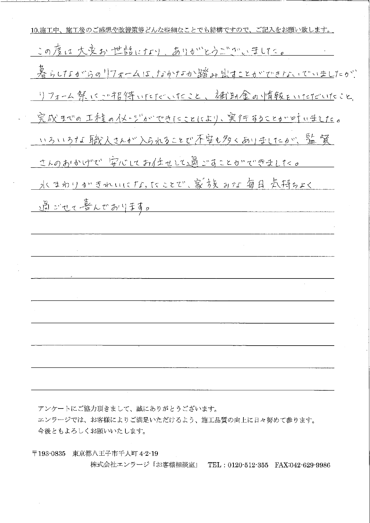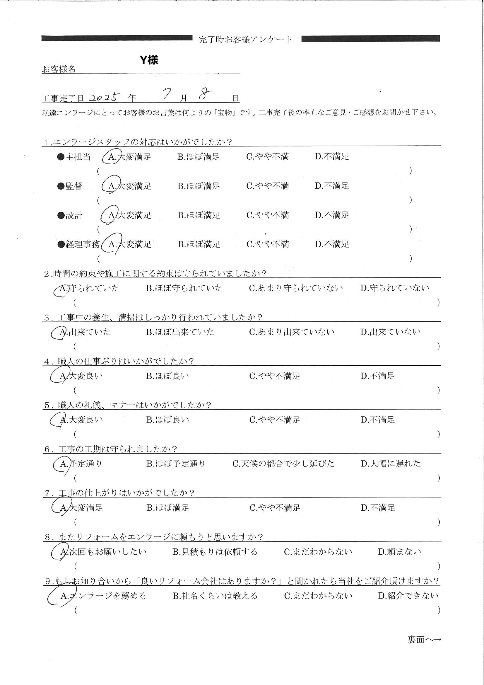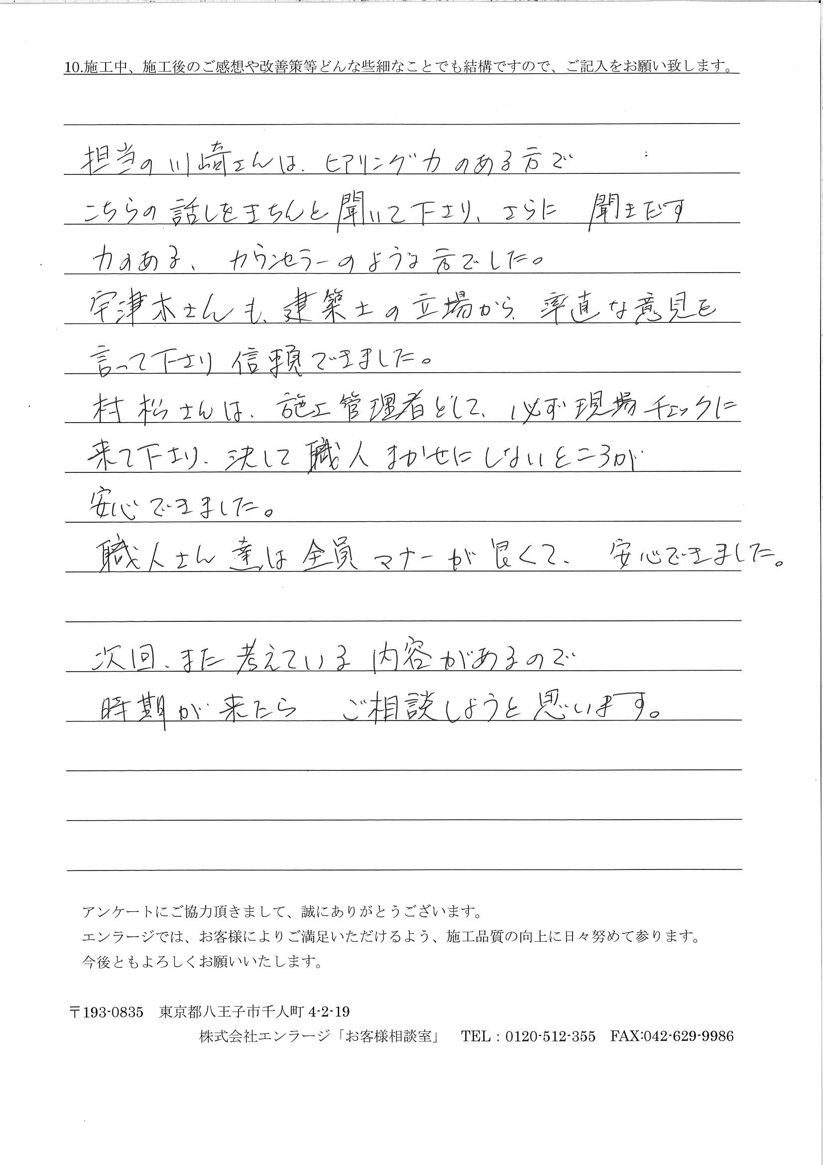 Y様 この度はご自宅の工事をお任せくださり、誠にありがとうございます。また、施工後のアンケートにご協力頂き、重ねてお礼申し上げます。今回行った工事は当社でも実績の多い内容ではありますが、2×4構造のため施工時の制限が多く、職方の技術がないと綺麗に仕上げることは難しかったと思います。施工にあたり、大工さん・電気屋さん・水道屋さんなど、様々な職人さんが携わりました。職方の皆様の技術力はもちろんのこと、彼らをまとめてあげて現場管理をした監督や、構造の確認・施工計画を行った設計担当者、彼らの連係プレーによりしっかりと工事を終えることができました。その結果、Y様から工事に対してご満足のお声を頂くことができて大変うれしく思います。またお力になれることがございましたら、是非お声がけくださいませ。今後ともどうぞよろしくお願いいたします。プランナー 川崎