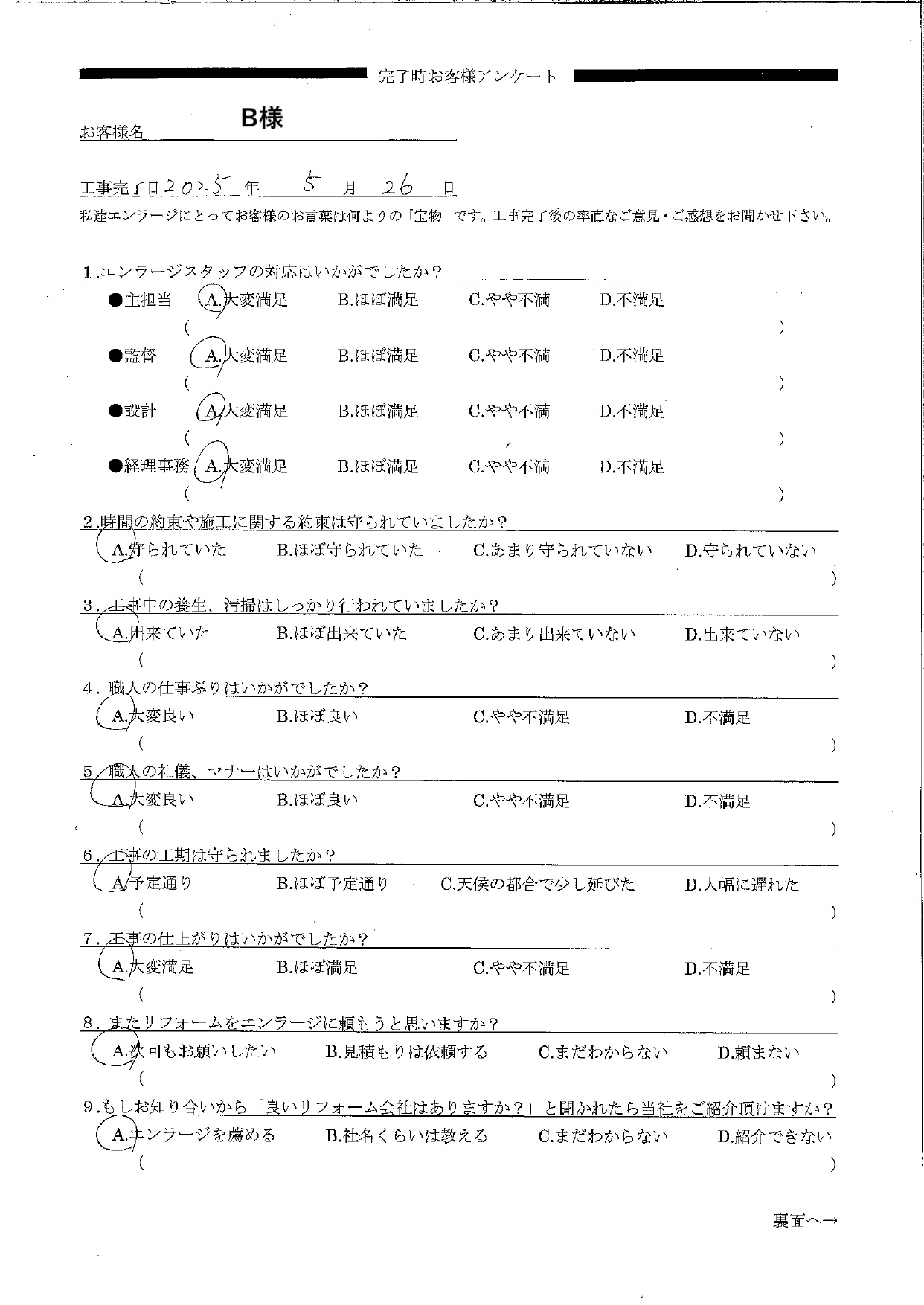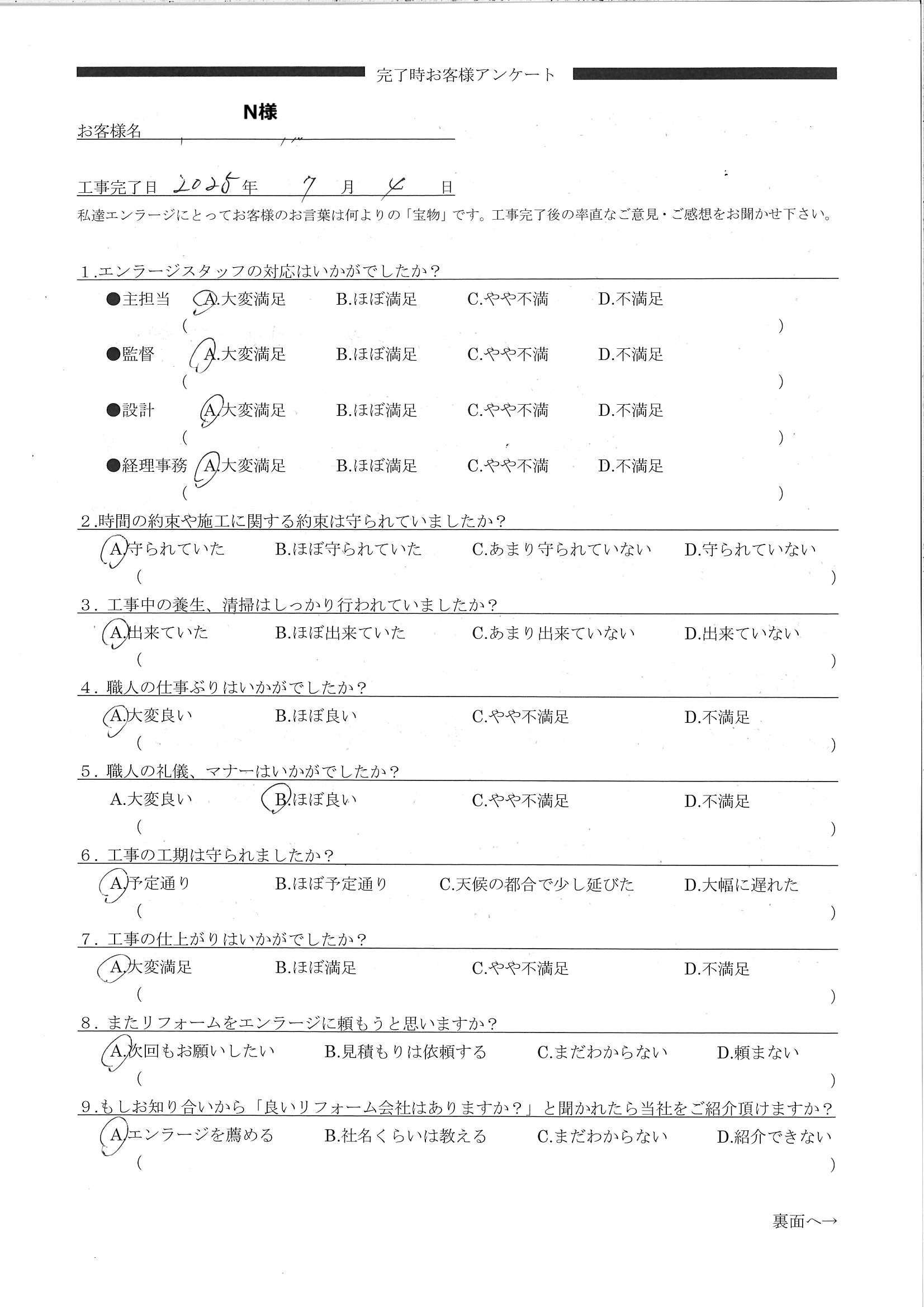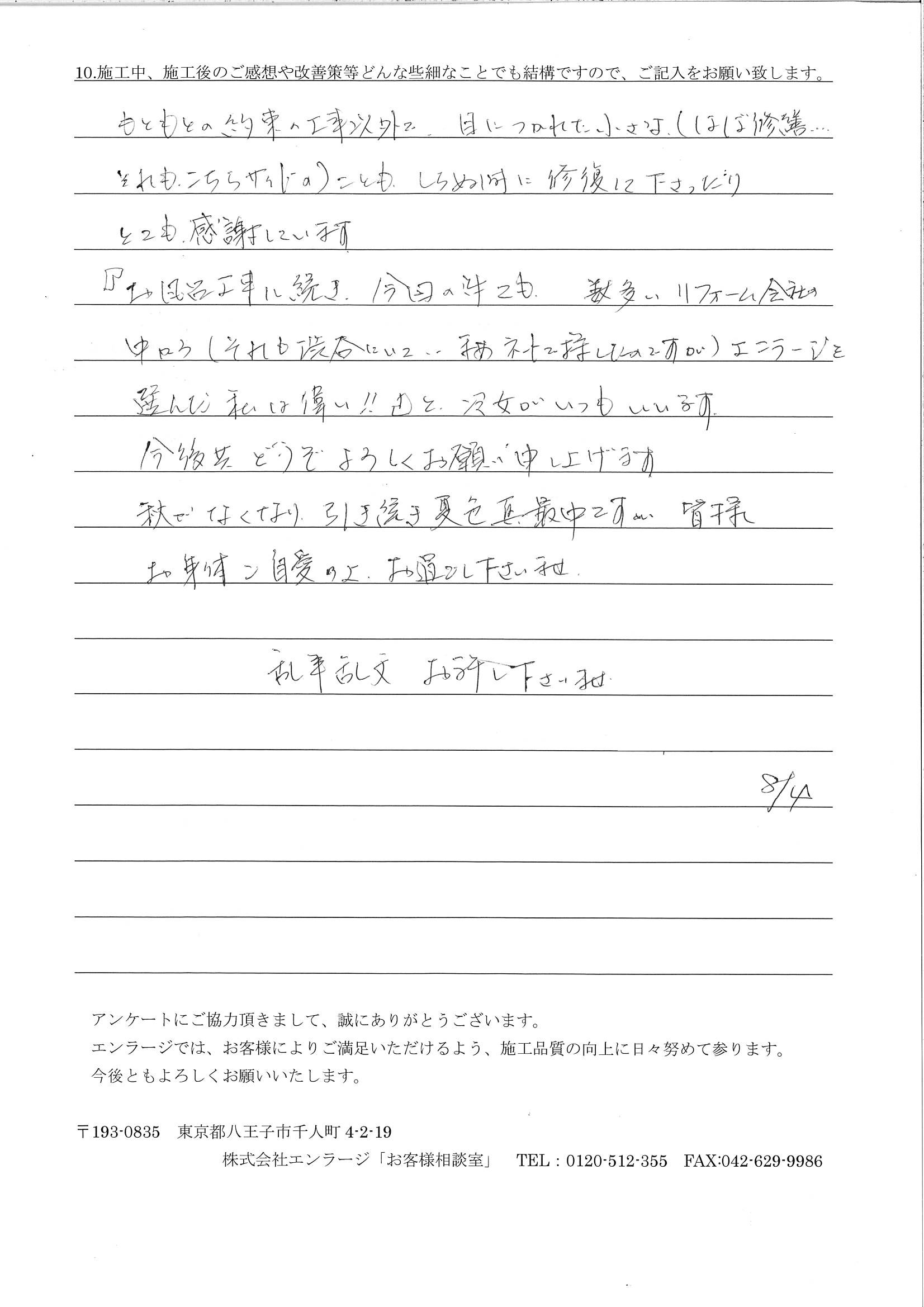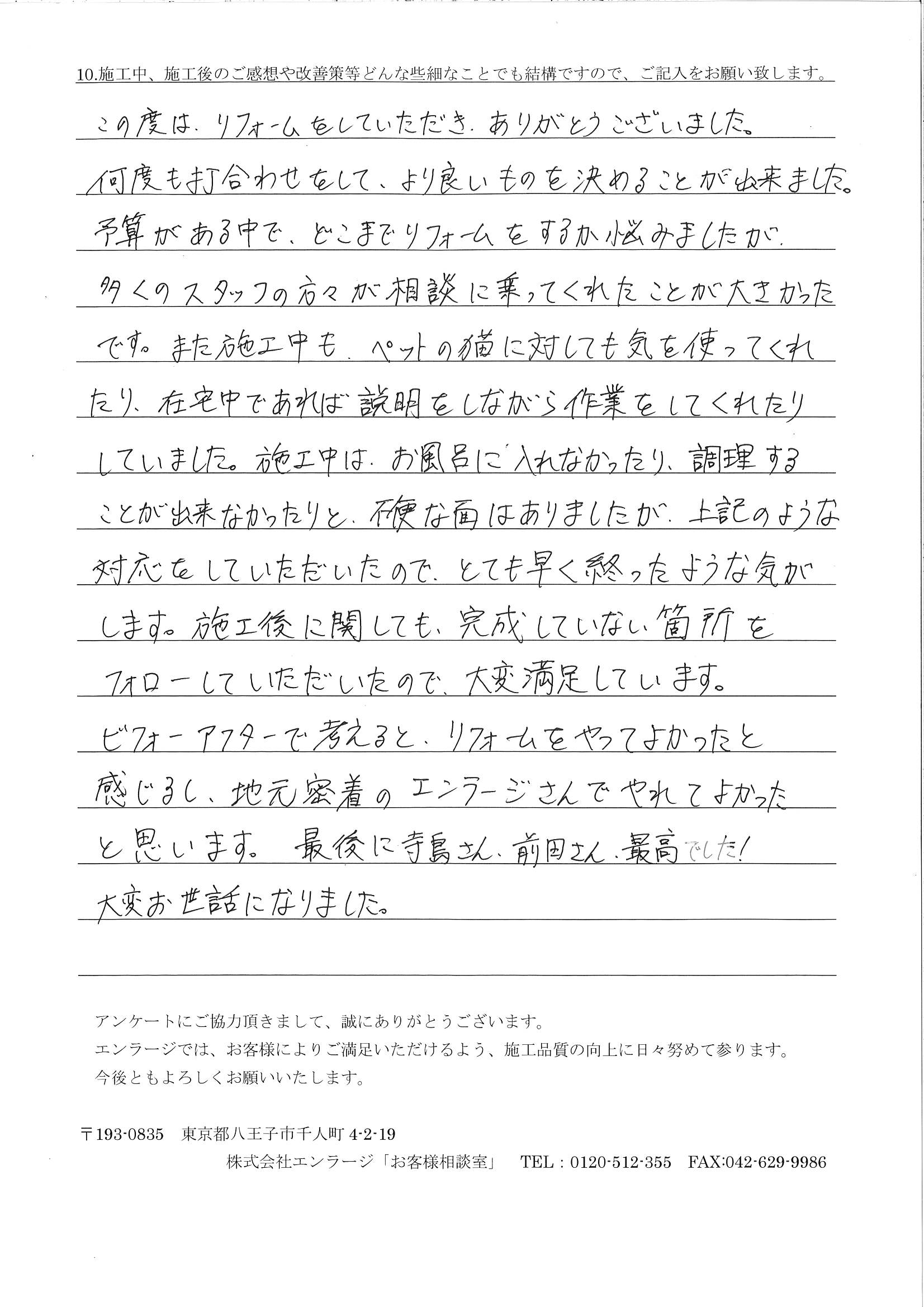 Y様 この度はご自宅の工事をお任せくださり、誠にありがとうございます。また、施工後のアンケートにご協力頂き、重ねてお礼申し上げます。今回行った工事は当社でも実績の多い内容ではありますが、2×4構造のため施工時の制限が多く、職方の技術がないと綺麗に仕上げることは難しかったと思います。施工にあたり、大工さん・電気屋さん・水道屋さんなど、様々な職人さんが携わりました。職方の皆様の技術力はもちろんのこと、彼らをまとめてあげて現場管理をした監督や、構造の確認・施工計画を行った設計担当者、彼らの連係プレーによりしっかりと工事を終えることができました。その結果、Y様から工事に対してご満足のお声を頂くことができて大変うれしく思います。またお力になれることがございましたら、是非お声がけくださいませ。今後ともどうぞよろしくお願いいたします。プランナー 川崎