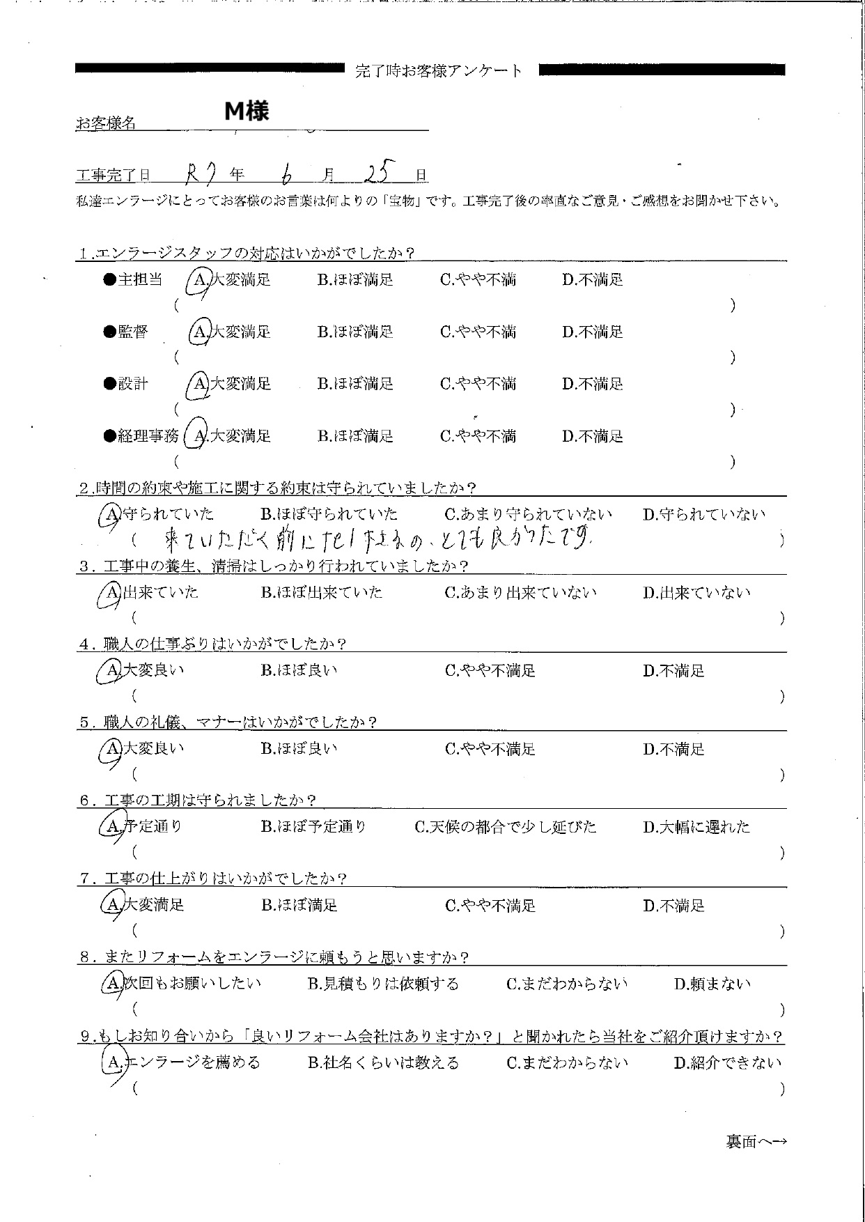 これからもM様のお家の事は何でもお任せください。今後ともよろしくお願いいたします。プランナー 田中
