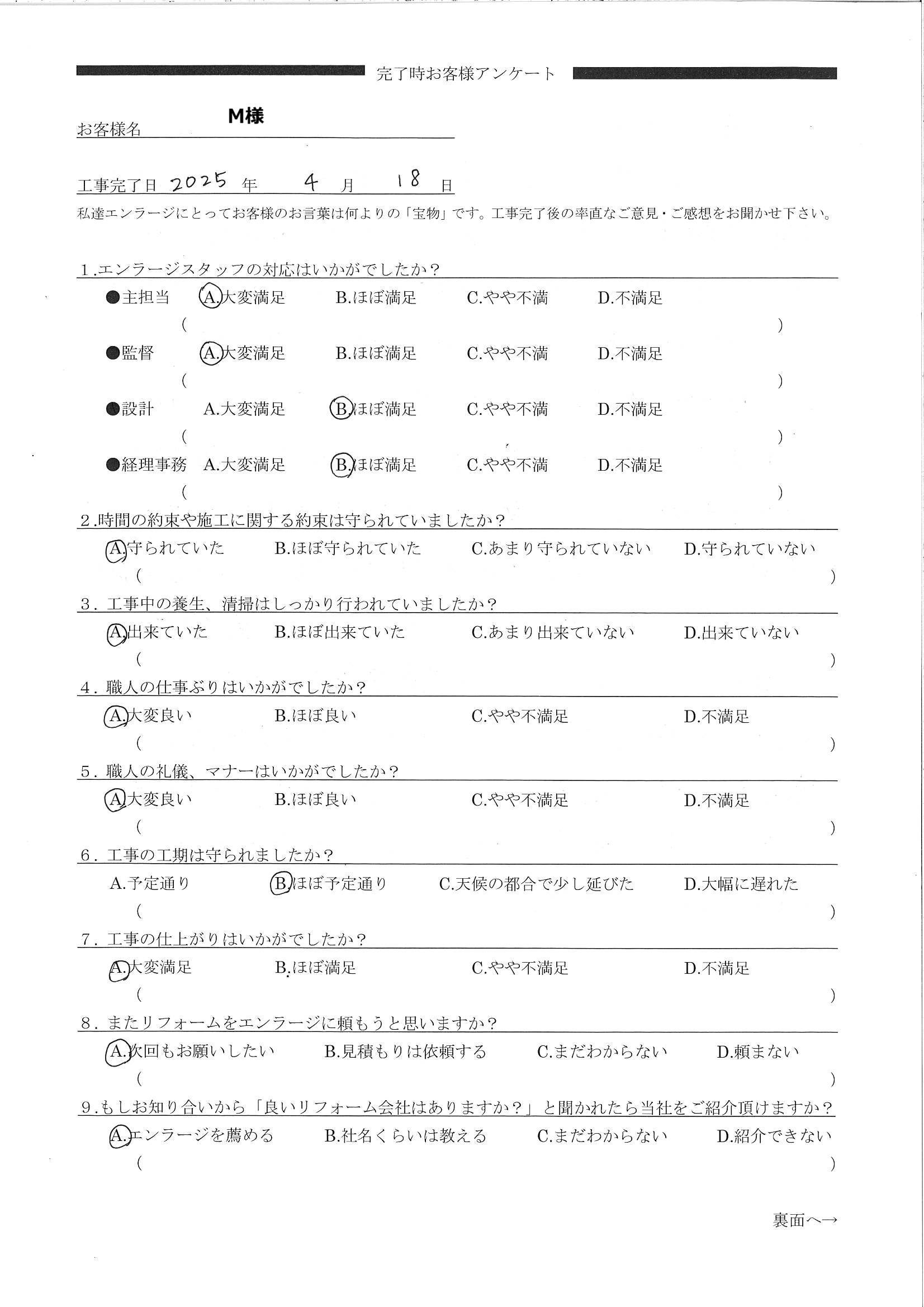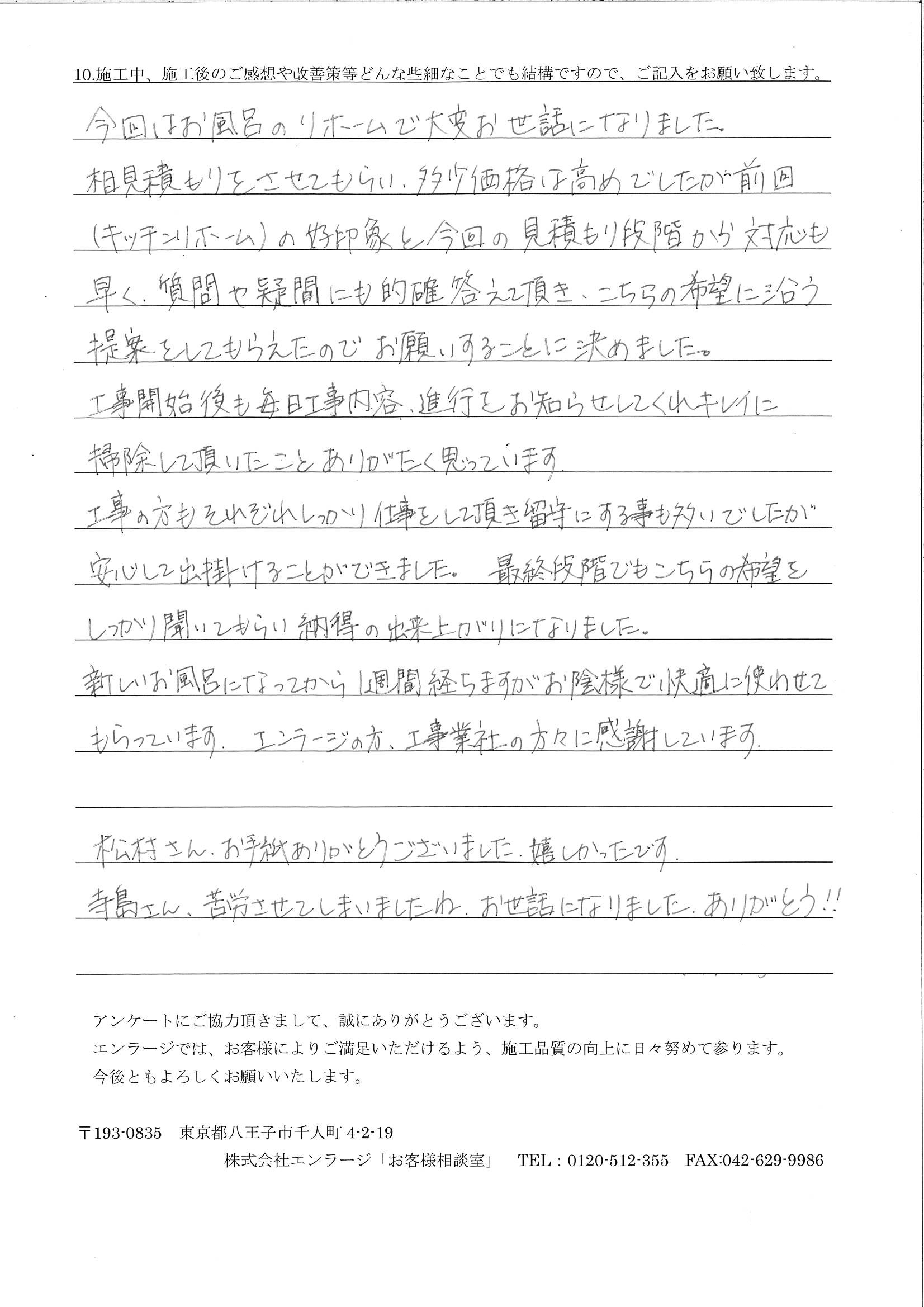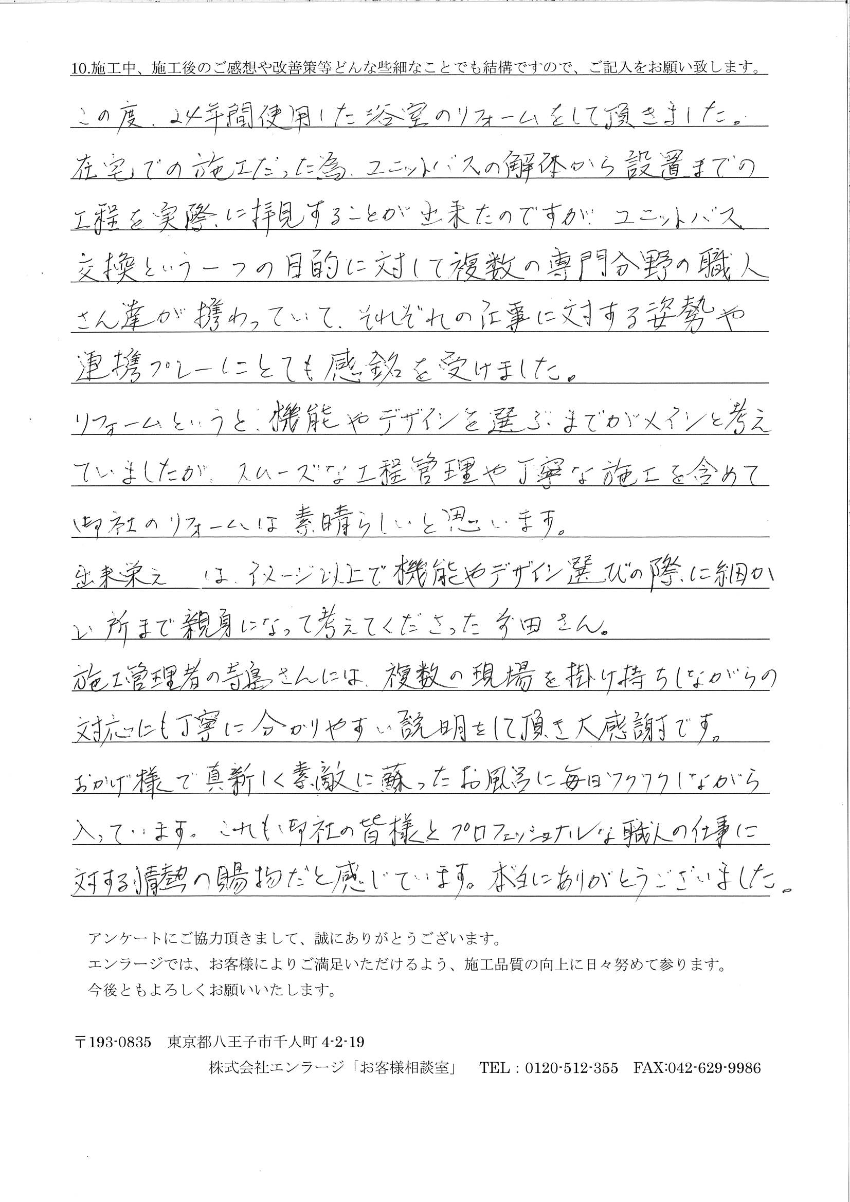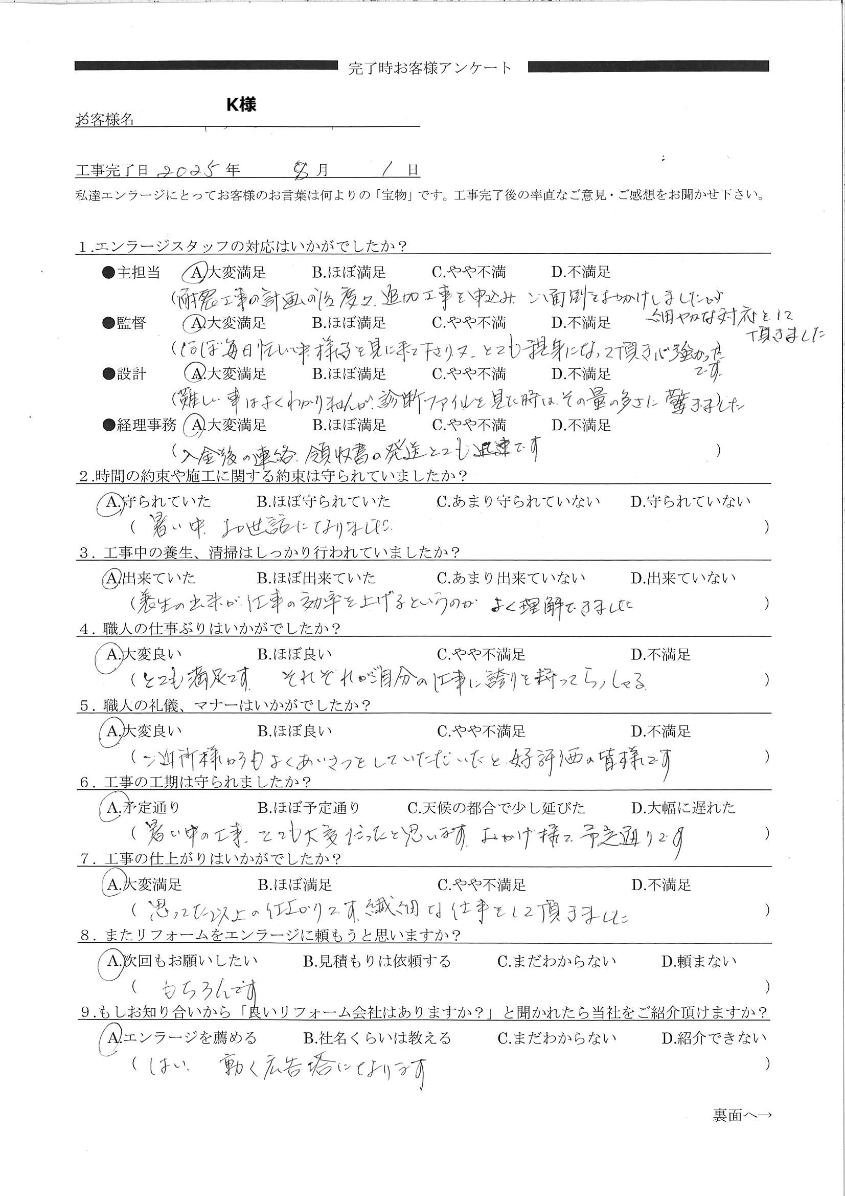 K様 この度は浴室リフォームをお任せいただき、誠にありがとうございました。数あるリフォーム会社の中から再び弊社をお選びいただけましたこと、大変嬉しく思っております。奥様がとても勉強熱心で、ご希望のユニットバスについて事前に詳しくお調べくださっていたおかげで、私からのご提案やご説明もスムーズに進めることができました。そのご協力もあり、スピーディーに対応させていただくことができ、心より感謝申し上げます。また、ご在宅での工事ということもあり、現場監督のきめ細やかな管理をご評価いただけたのも、大変励みになりました。今後もお住まいに関してお困りごとがございましたら、どうぞお気軽にご相談ください。引き続き末永いお付き合いを、よろしくお願い申し上げます。 プランナー 松村