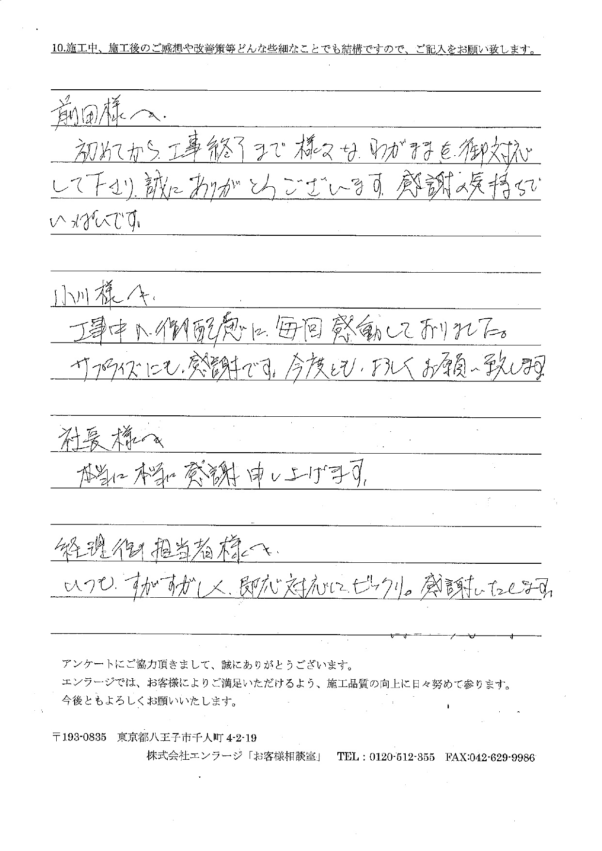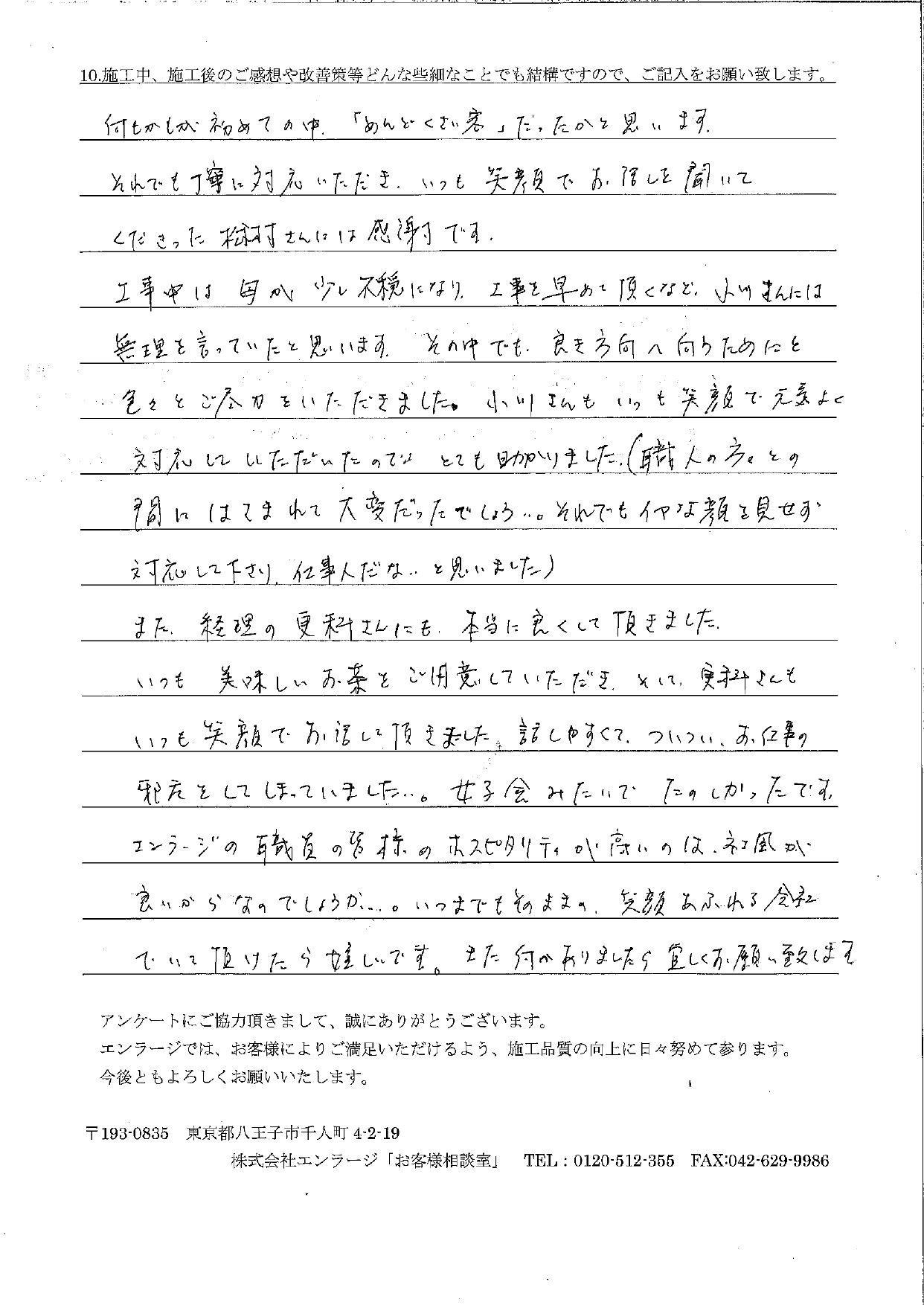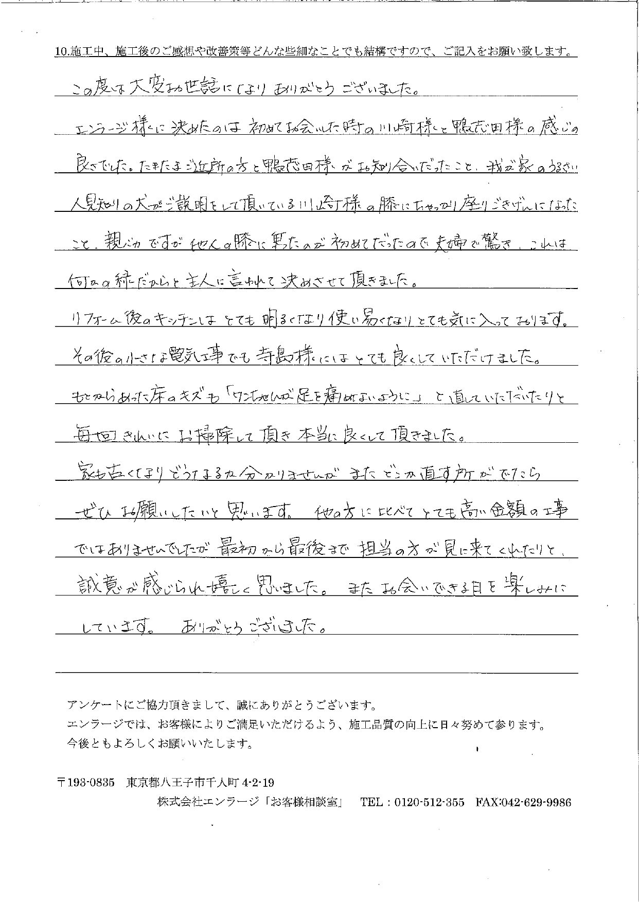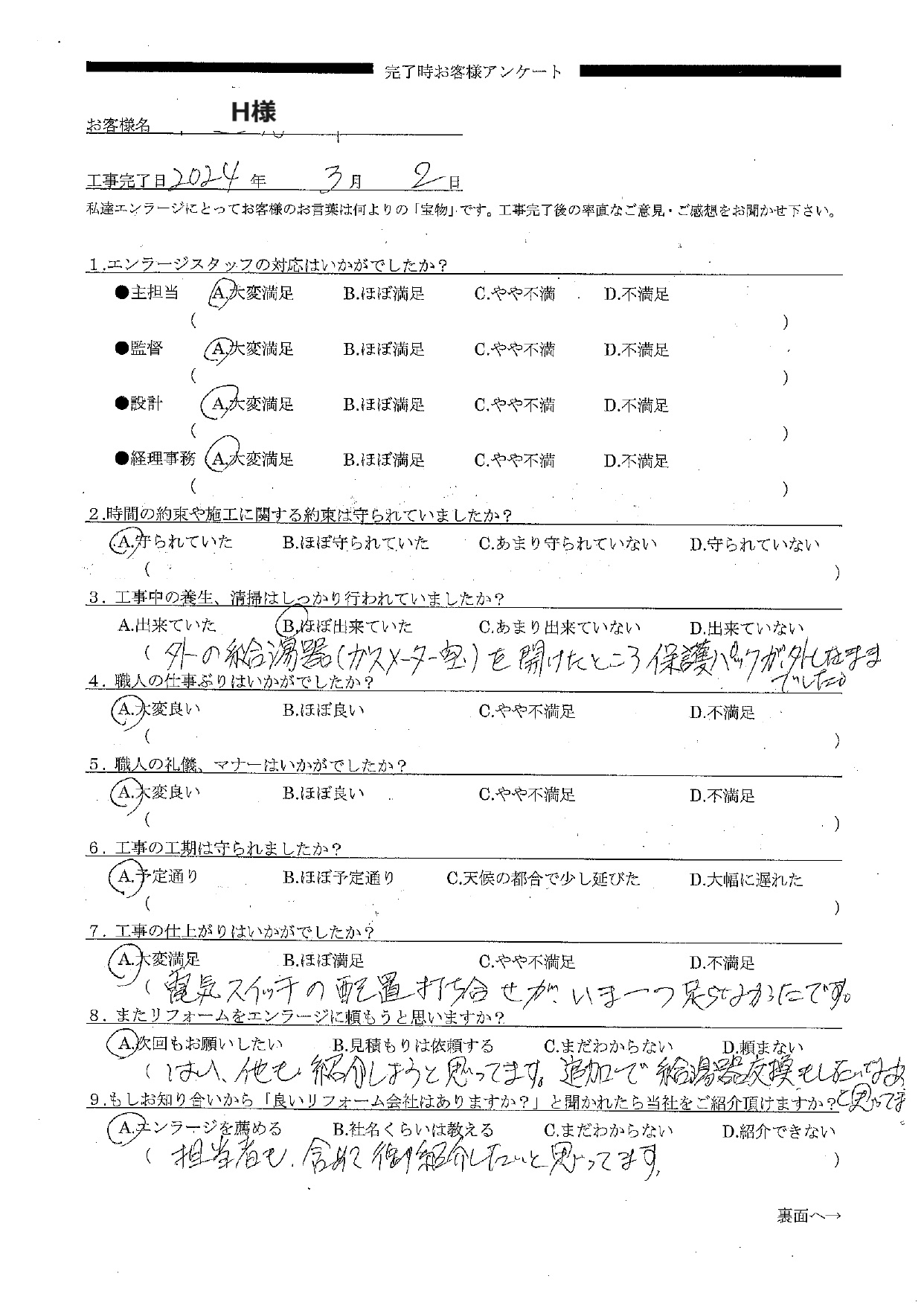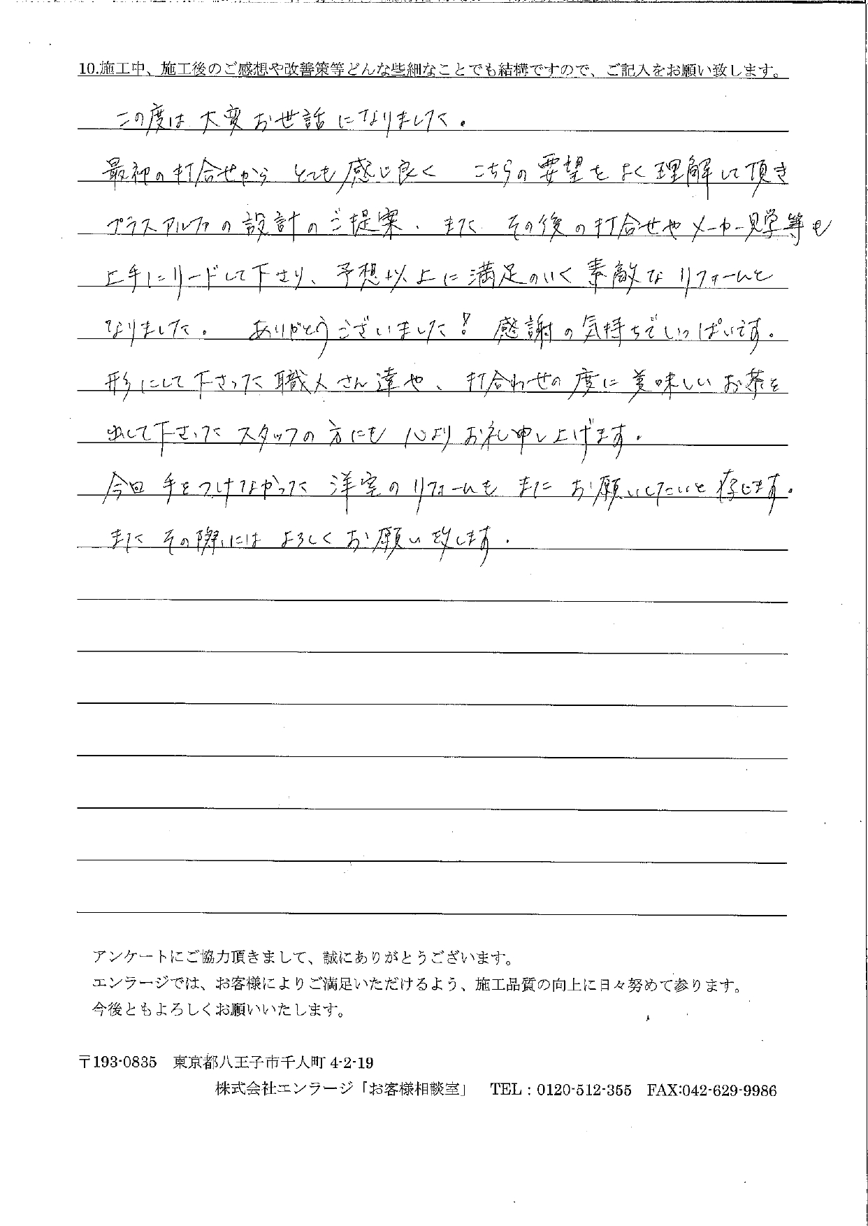 H様 このたびはリフォーム工事をお任せいただき誠にありがとうございました。また大変嬉しいアンケートをお送りいただき重ねて御礼申し上げます。H様はご自宅をリフォームするか、お家を売却してマンションを買うか悩まれてましたね。立地も良く住み慣れた環境で、ご家族みなさまが快適にお過ごしいただけるようプランのご提案から工事完了まで精一杯尽くさせていただきました。工事完成後は、新築マンションのように生まれ変わご満足をいただけて、なにより嬉しく思います。これから皆様で楽しみながら心地よくお過ごしいただける事をお祈り申し上げます。なにかございましたら、お近くですのでいつでもお声掛け下さい。今後共どうよろしくお願いいたします。プランナー 前田