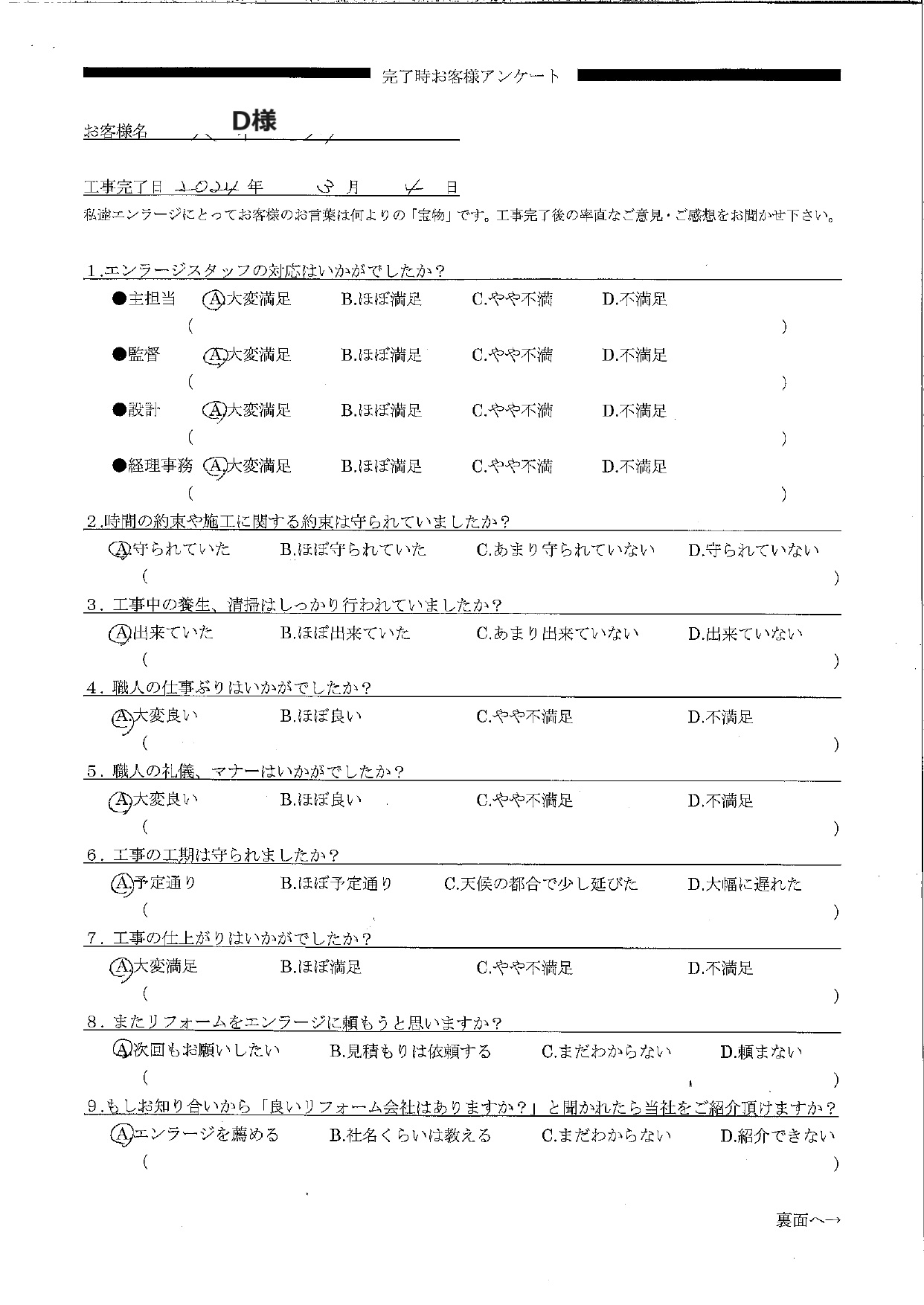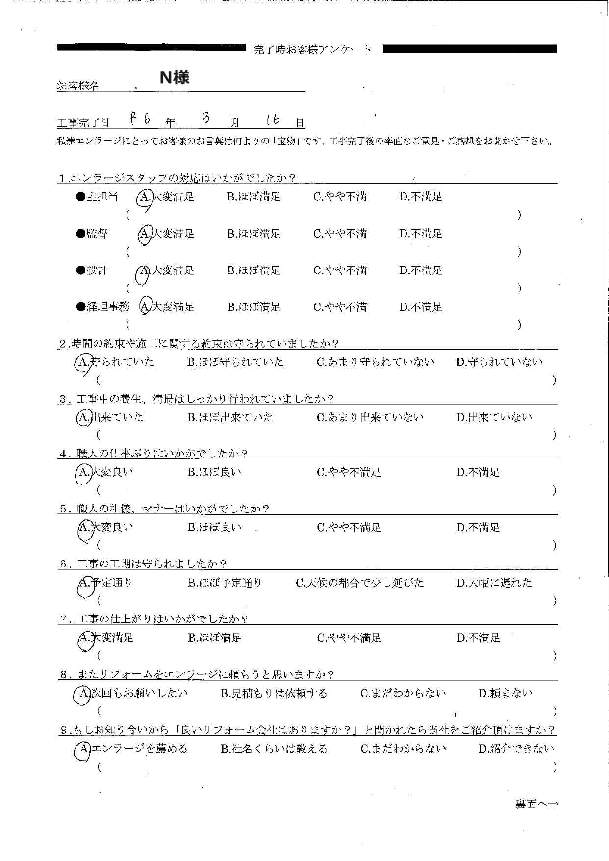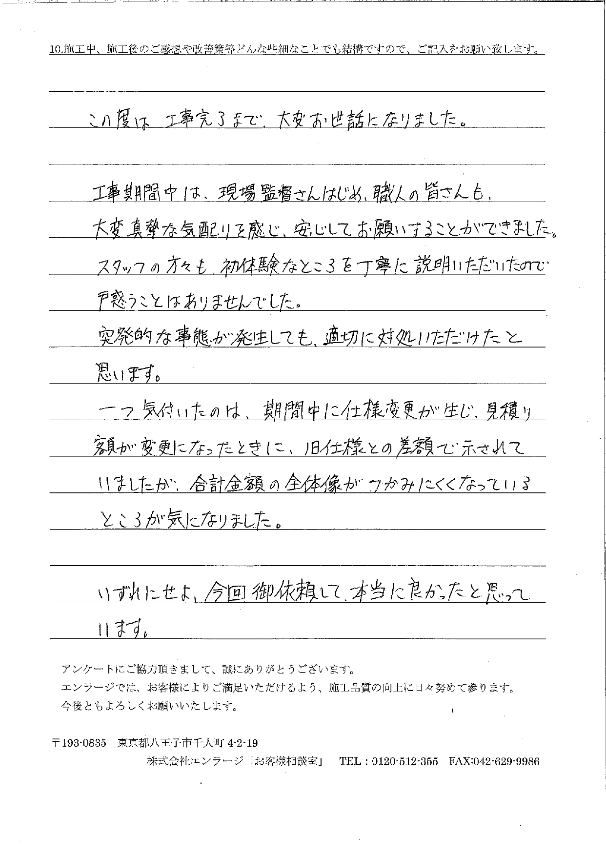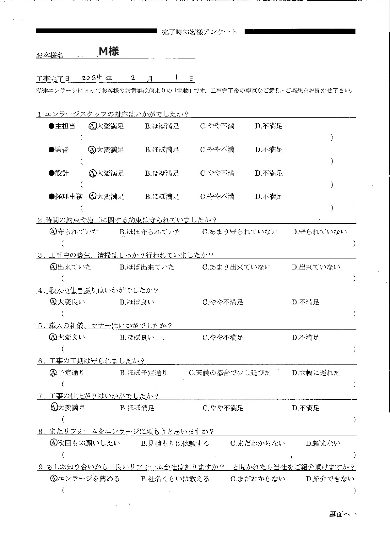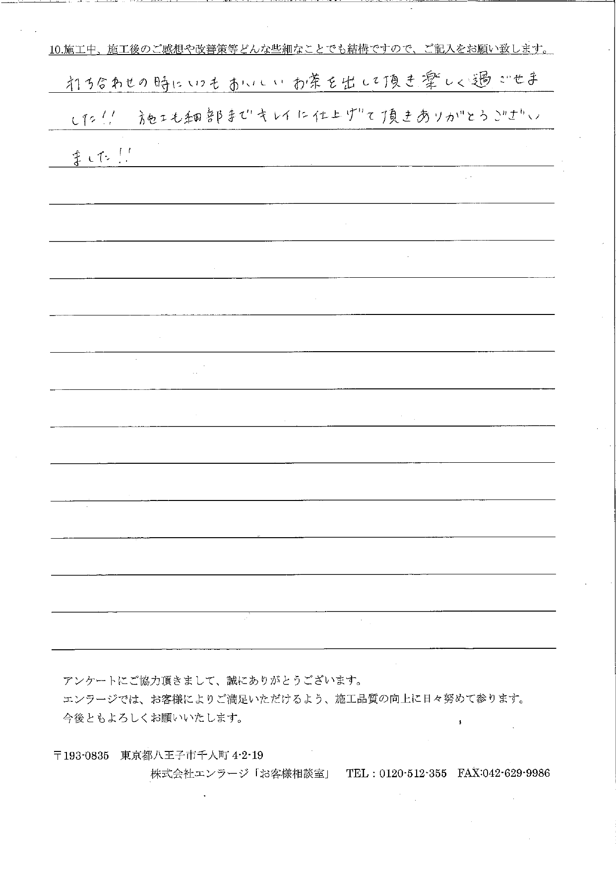 H様 このたびはリフォーム工事をお任せいただき誠にありがとうございました。また大変嬉しいアンケートをお送りいただき重ねて御礼申し上げます。H様はご自宅をリフォームするか、お家を売却してマンションを買うか悩まれてましたね。立地も良く住み慣れた環境で、ご家族みなさまが快適にお過ごしいただけるようプランのご提案から工事完了まで精一杯尽くさせていただきました。工事完成後は、新築マンションのように生まれ変わご満足をいただけて、なにより嬉しく思います。これから皆様で楽しみながら心地よくお過ごしいただける事をお祈り申し上げます。なにかございましたら、お近くですのでいつでもお声掛け下さい。今後共どうよろしくお願いいたします。プランナー 前田