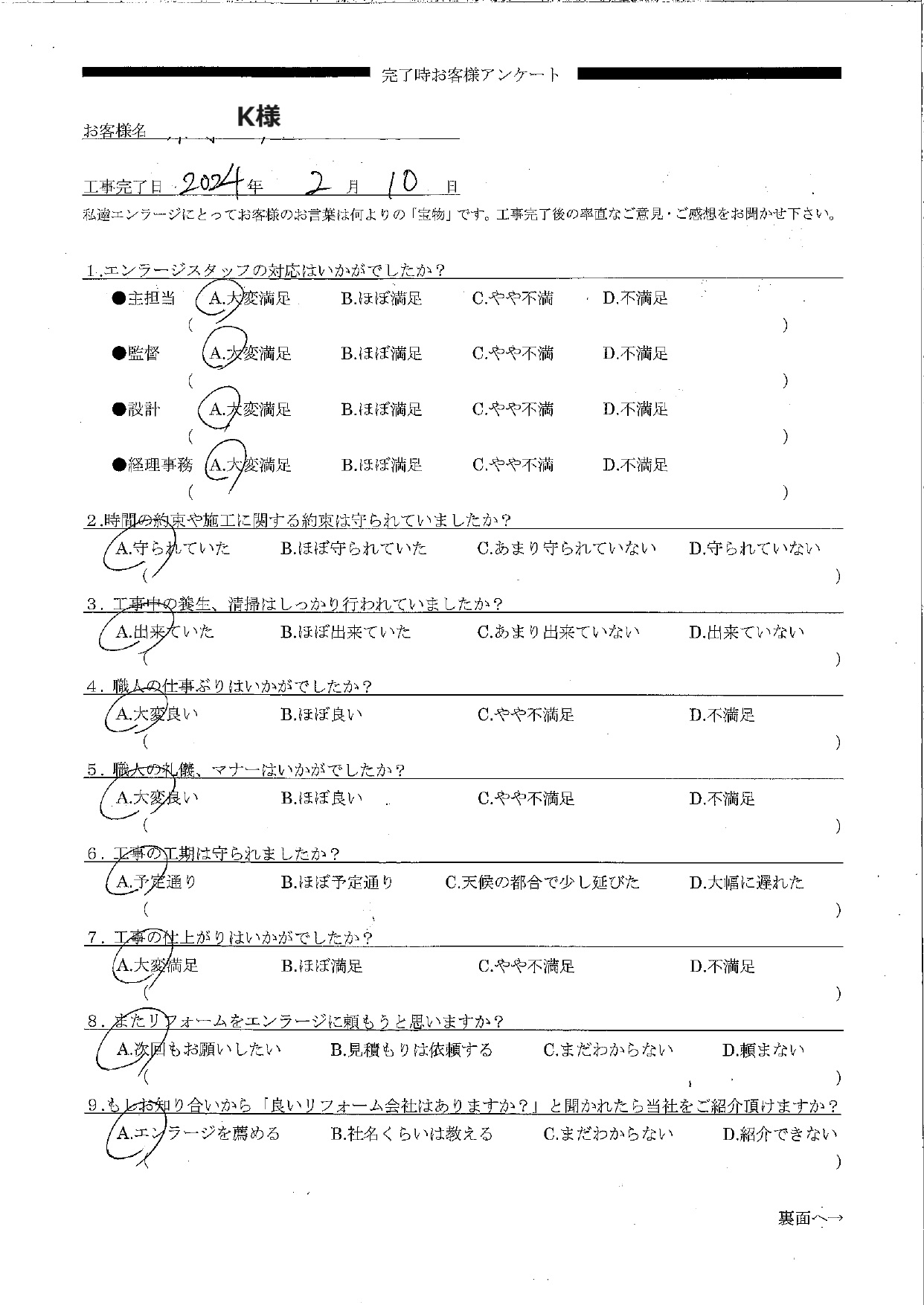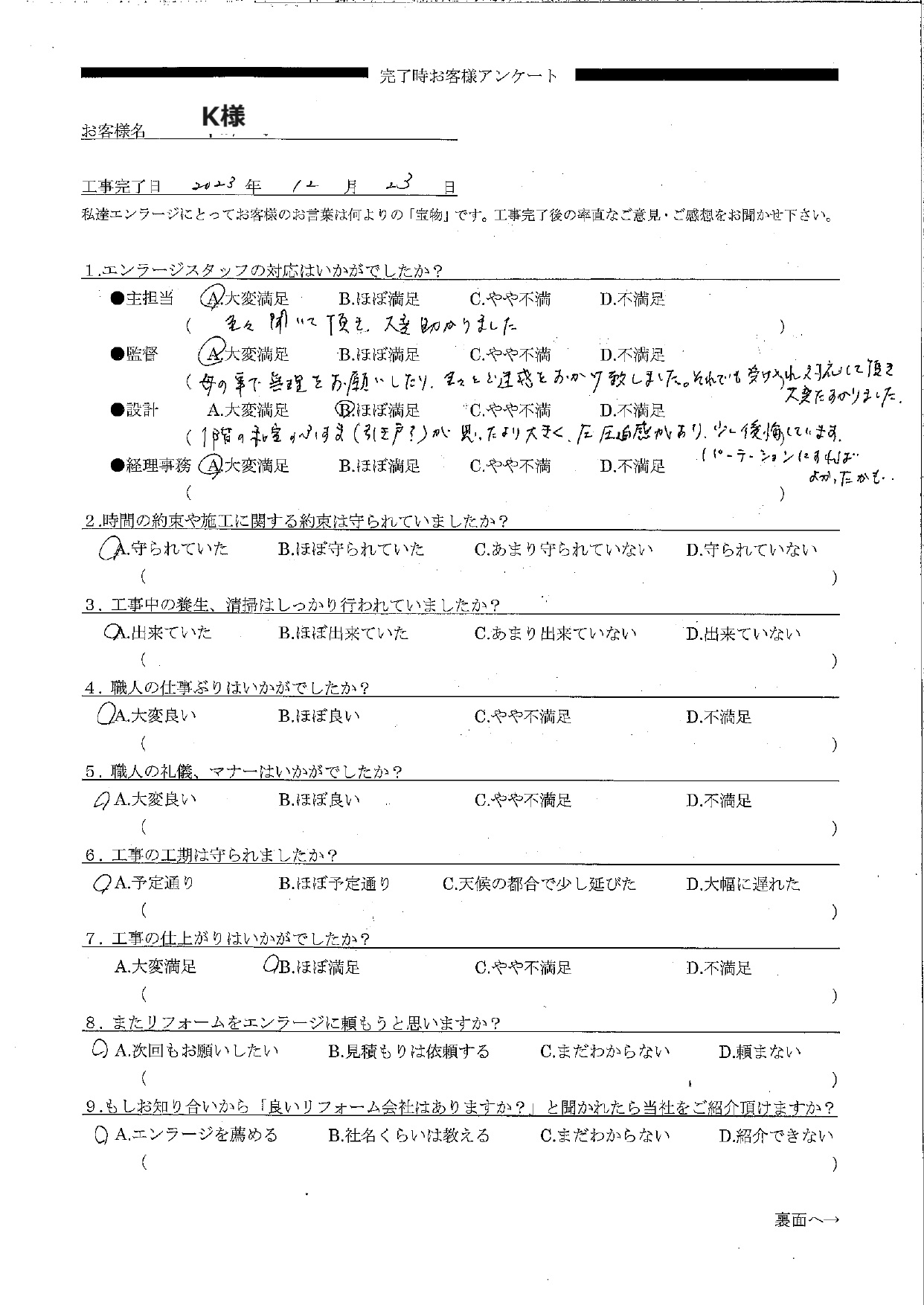 K様へ この度はご実家のリフォームをお任せいただき誠にありがとうございました。K様が初めてふらっとショールームにご来店くださったときから楽しくお話ができ、仕様の打ち合わせの際は私も女子会の気分で毎回楽しかったです。工事中はお母様にも仮住まいをしていただきご不便おかけいたしましたが、監督の小川や職方一同、お母様が早めに戻ってきても安全に生活できるようにと工夫をしながら進めさせていただきました。その結果、お喜びいただけて大変嬉しく思います。また何かございましたらお気軽にご連絡くださいませ。今後とも末永いお付き合いをよろしくお願いいたします。 プランナー 松村