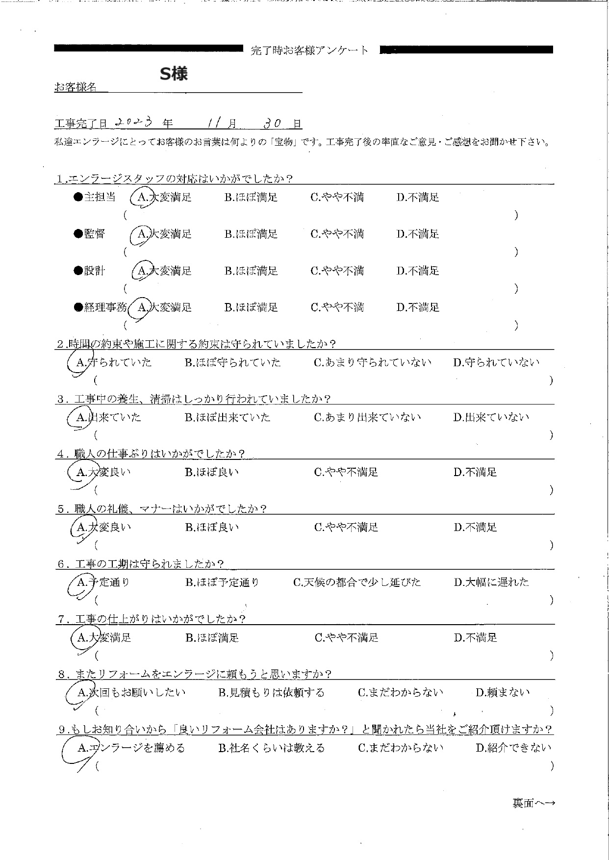 S様 この度はマンションの全面リフォームをお任せいただき、誠にありがとうございました。「予想以上に満足のいくリフォーム」と仰っていただけて、とても嬉しく思います。次回の工事も時期が来ましたらご連絡下さいね。今後ともどうぞ宜しくお願い致します。プランナー 伊藤