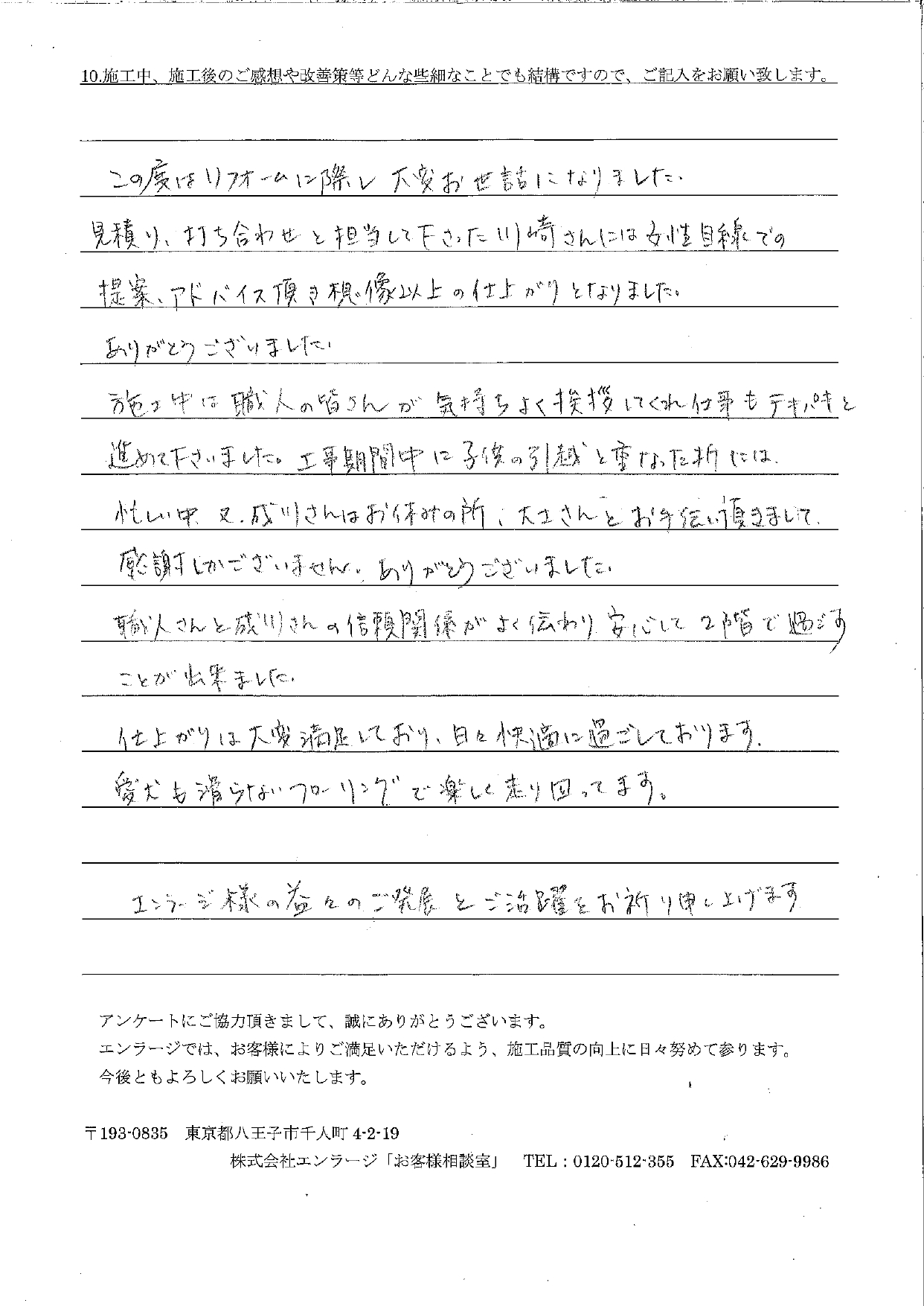 K様へ この度は私共にLDK・和室の洋室化工事をお任せ頂き、ありがとうございました。ご在宅での工事でしたので、いつもの生活と異なりご不便な点も多かったかと思います。そのような中でも職人さんが作業をしやすいようご協力くださり、感謝申し上げます。