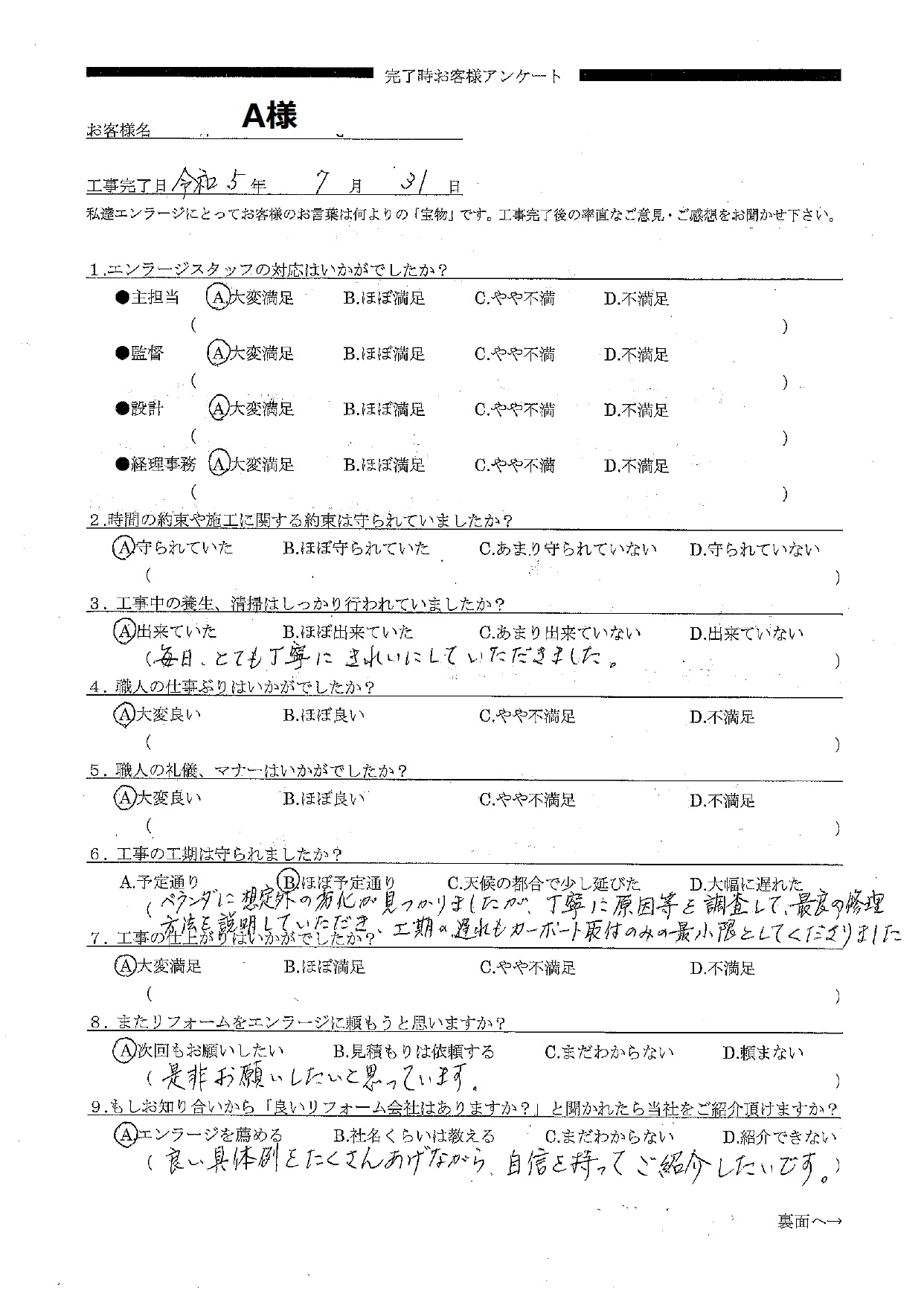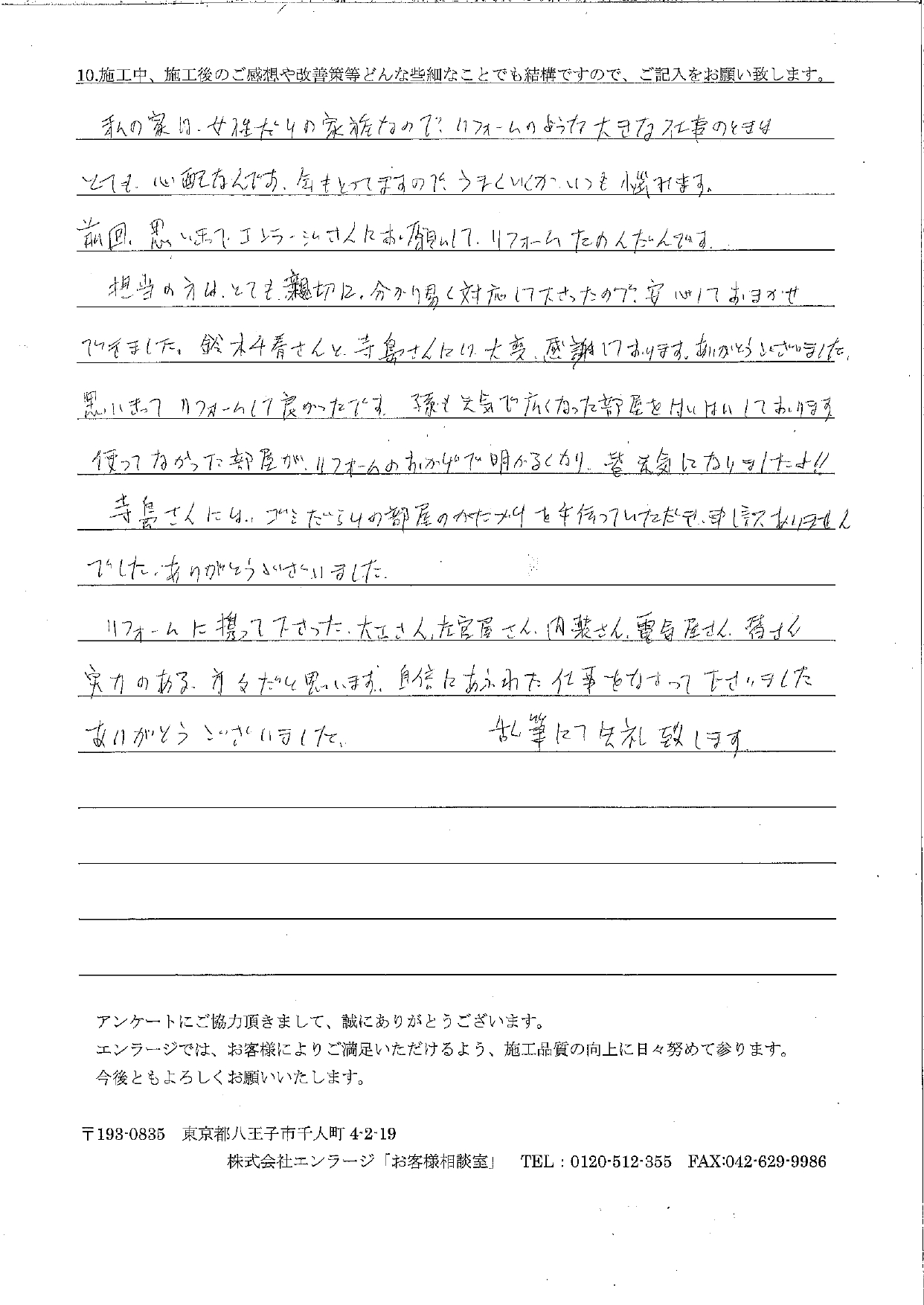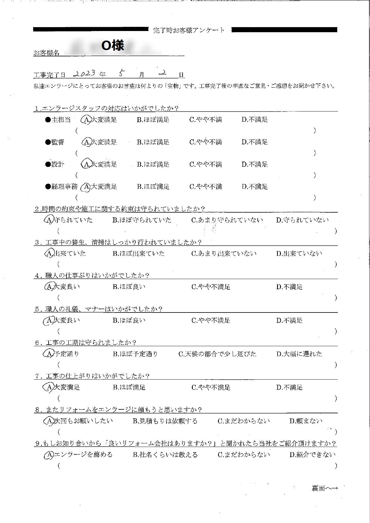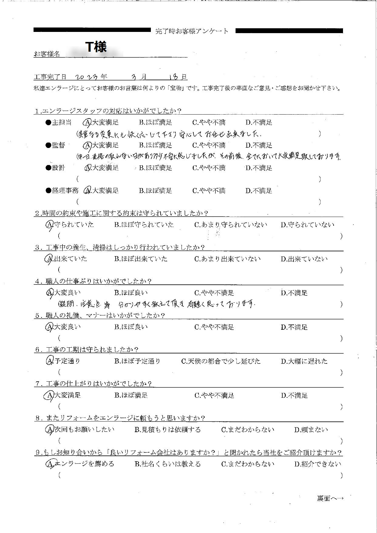 T様 この度は、リフォーム工事をお任せいただき誠にありがとうございました。また、このような満点のアンケートをいただき大変嬉しく思います。工事中は、OBでもあるT様に喜んでいただけるよう職方と共に尽力したので、喜んでいただけて本当にうれしいです。今後も何かお困りごとなどございましたらご連絡下さいね。今後ともどうぞ宜しくお願い致します。施工管理 寺島