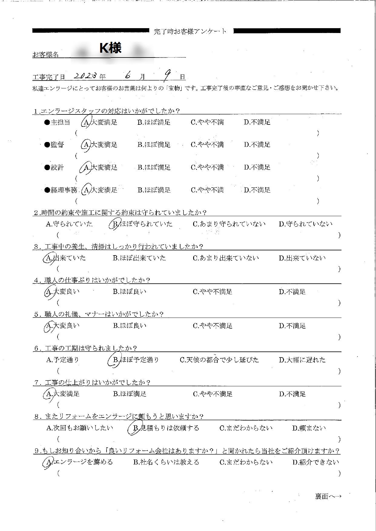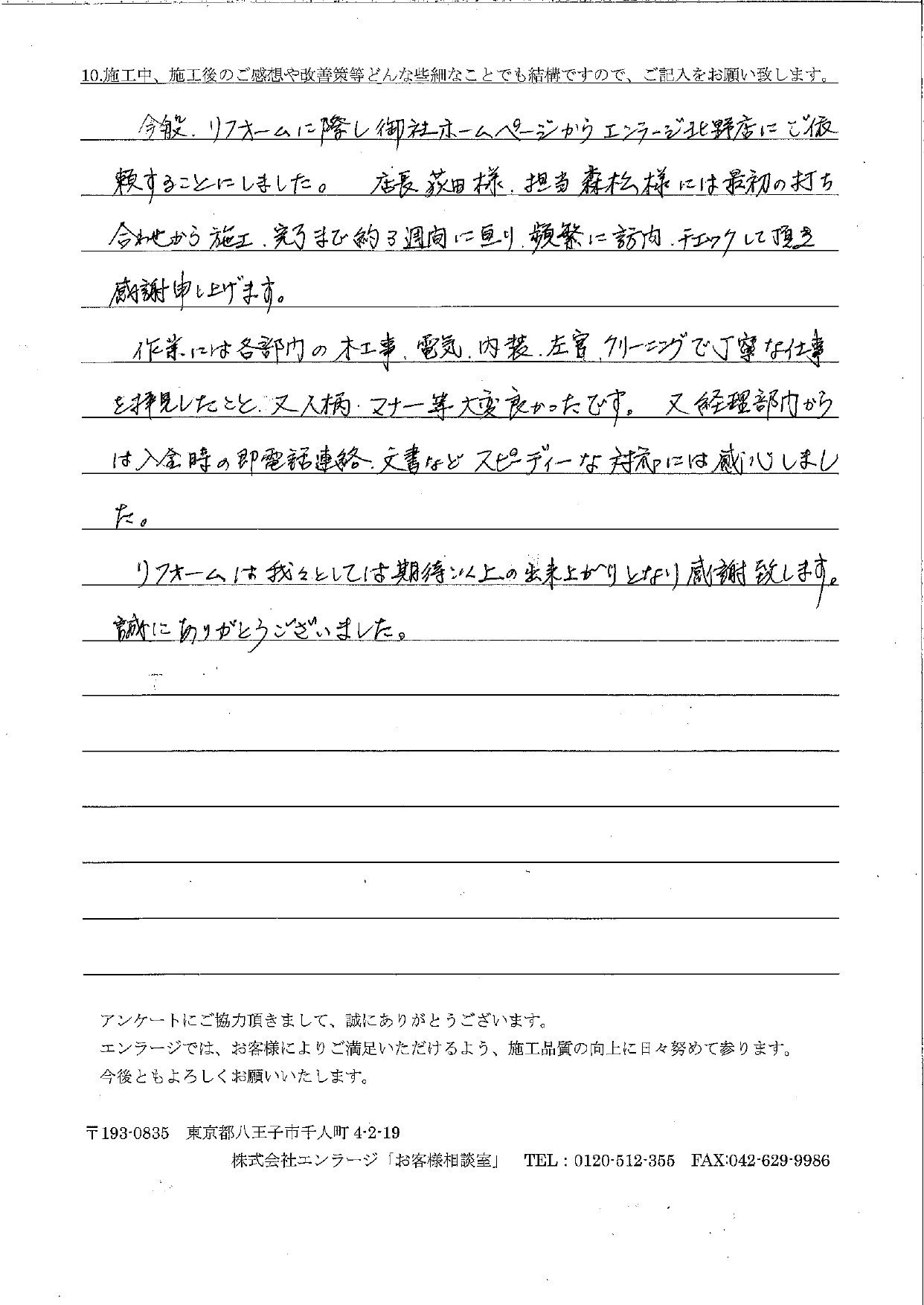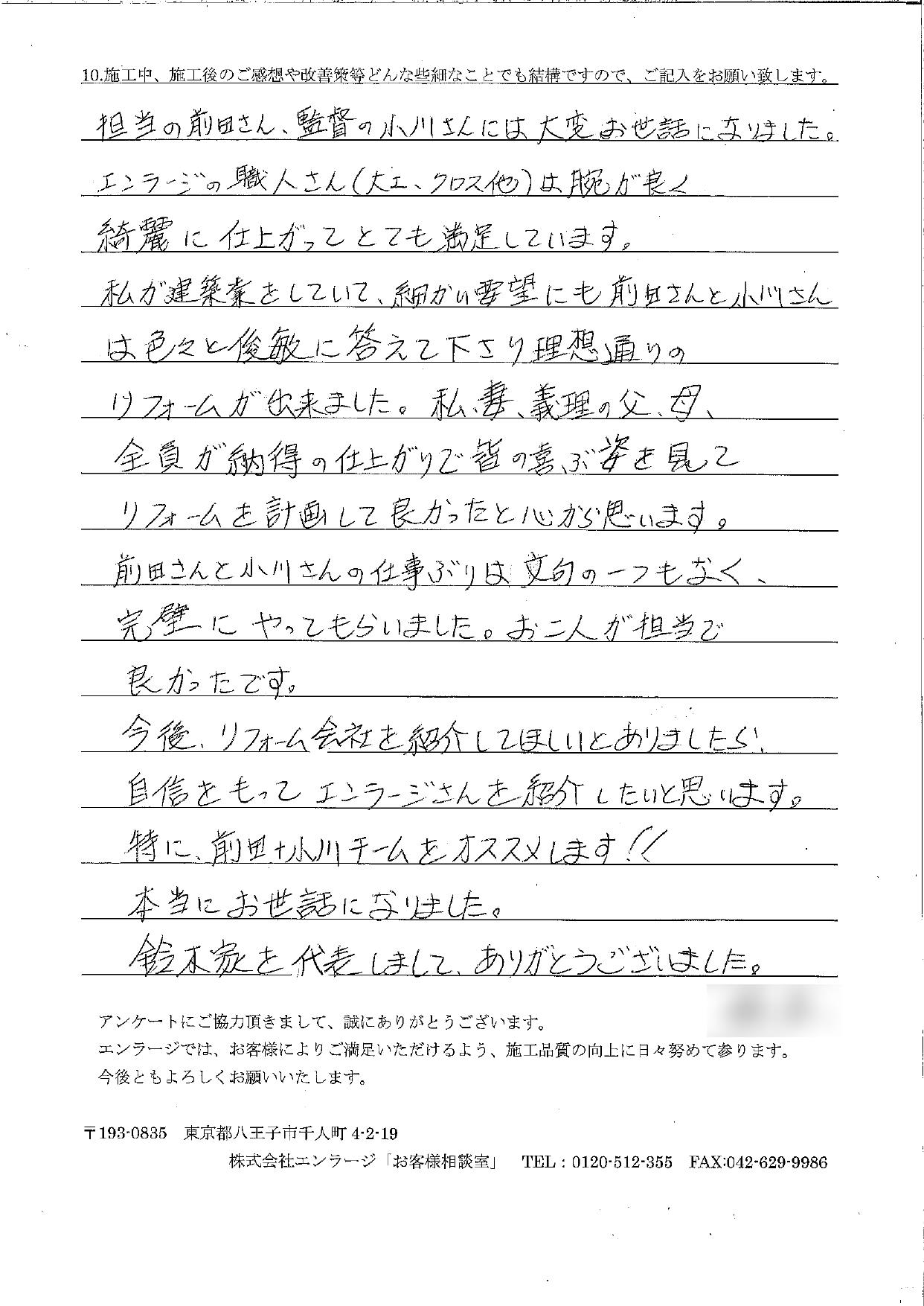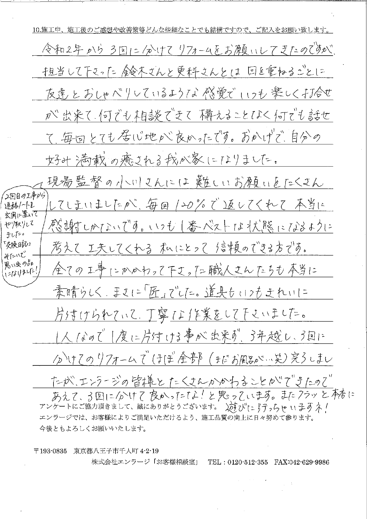 T様 この度は、リフォーム工事をお任せいただき誠にありがとうございました。また、このような満点のアンケートをいただき大変嬉しく思います。工事中は、OBでもあるT様に喜んでいただけるよう職方と共に尽力したので、喜んでいただけて本当にうれしいです。今後も何かお困りごとなどございましたらご連絡下さいね。今後ともどうぞ宜しくお願い致します。施工管理 寺島
