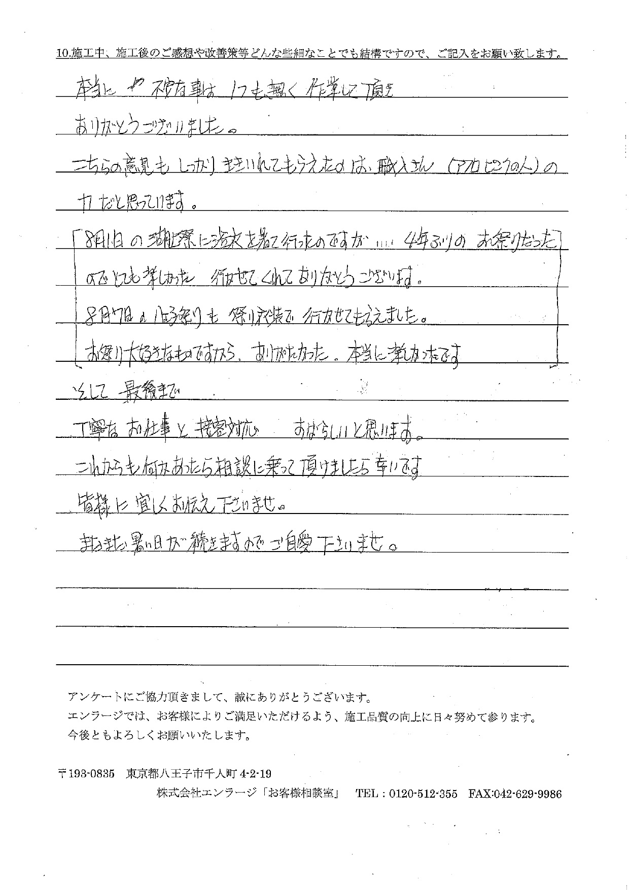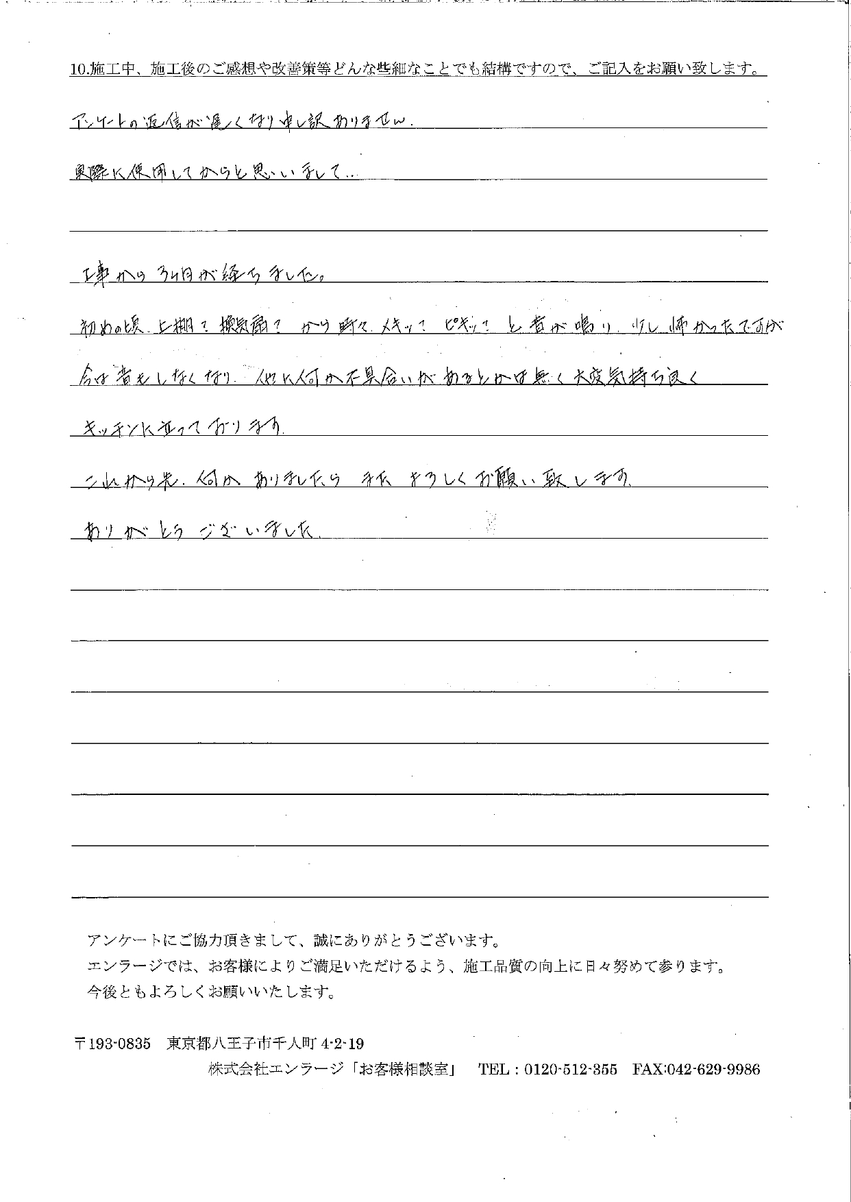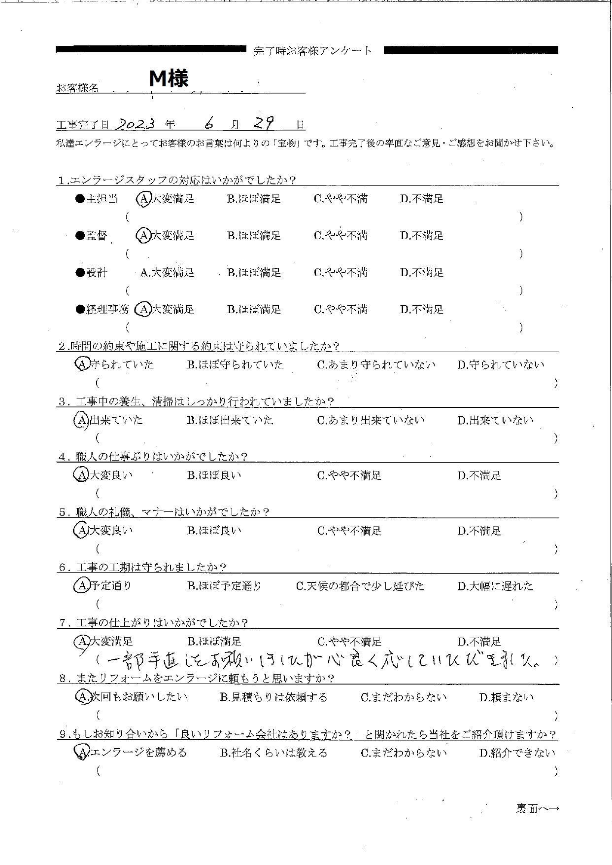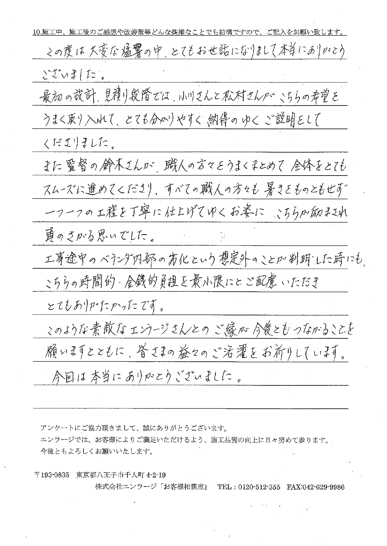 T様 この度は、リフォーム工事をお任せいただき誠にありがとうございました。また、このような満点のアンケートをいただき大変嬉しく思います。工事中は、OBでもあるT様に喜んでいただけるよう職方と共に尽力したので、喜んでいただけて本当にうれしいです。今後も何かお困りごとなどございましたらご連絡下さいね。今後ともどうぞ宜しくお願い致します。施工管理 寺島