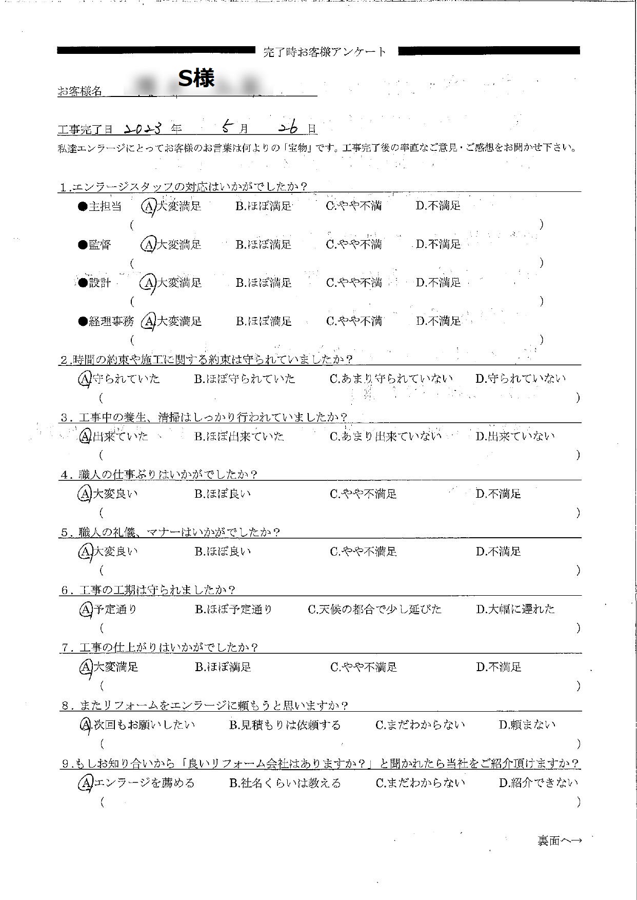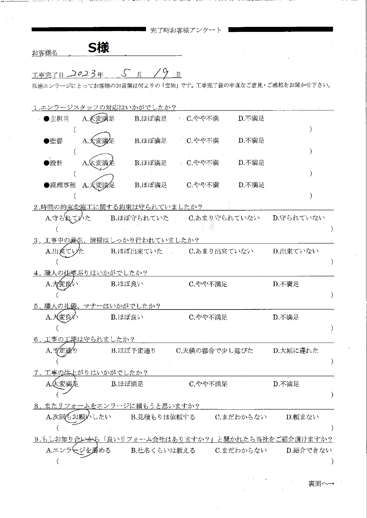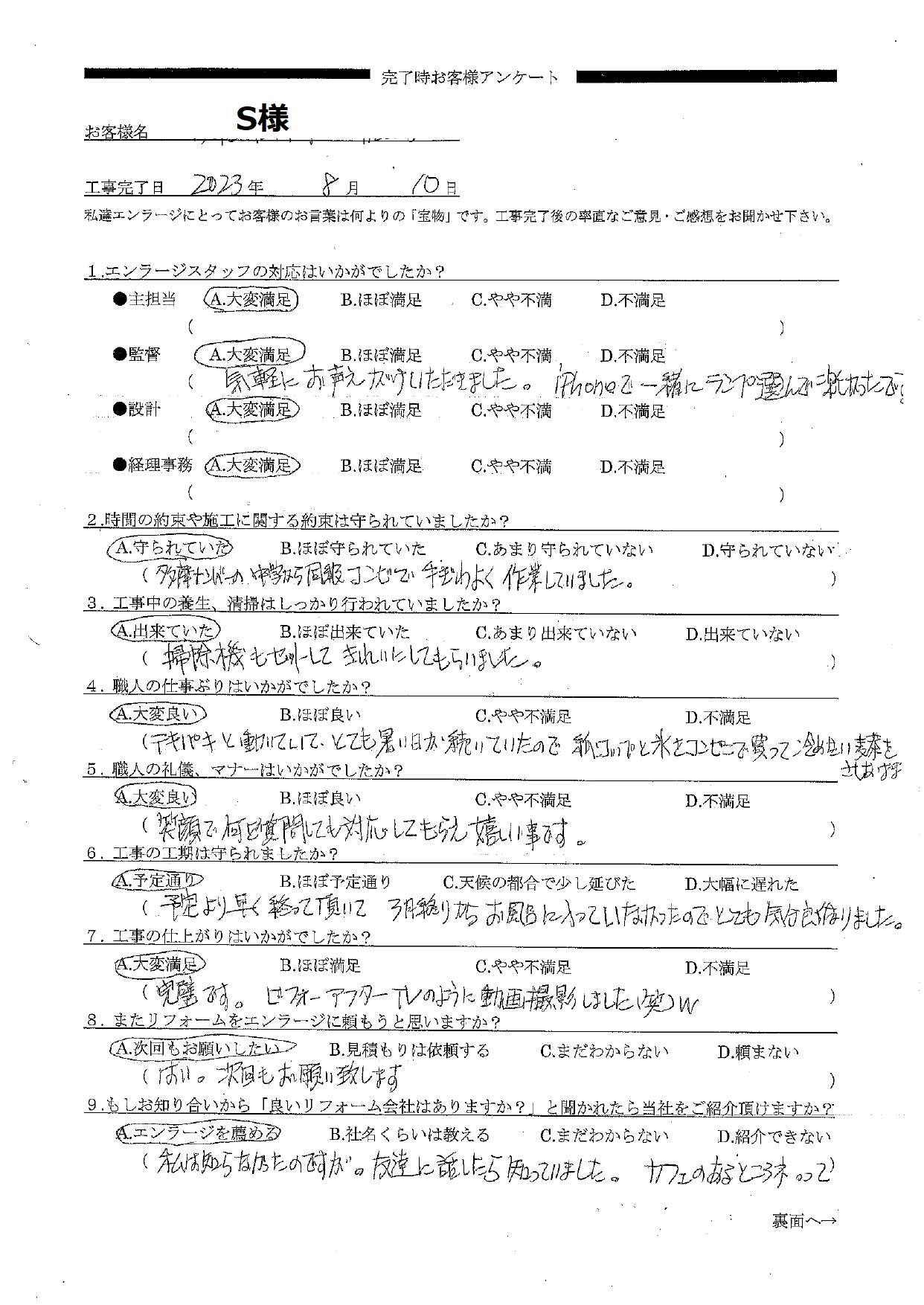 S様へ この度は二世帯化リフォームを当社にお任せいただき誠にありがとうございました。また、沢山のコメントをご記入くださり重ねてお礼申し上げます。S様は同じ建築業の社長さんなので、とても緊張しましたが、当社の職人さん達の技術を褒めて下さりとても嬉しいです。プラン提出の際には、「心を動かされたよ!」とおっしゃっていただき、S様の表情が柔らかくなった瞬間は今でも忘れません。工事が終わった後には、奥様から「出会えてよかった」とおっしゃって頂けて、とても自信になりました。S様の担当をすることができて良かったです。良い経験をさせていただき本当にありがとうございました。これからも末永いお付き合いをよろしくお願い申し上げます。