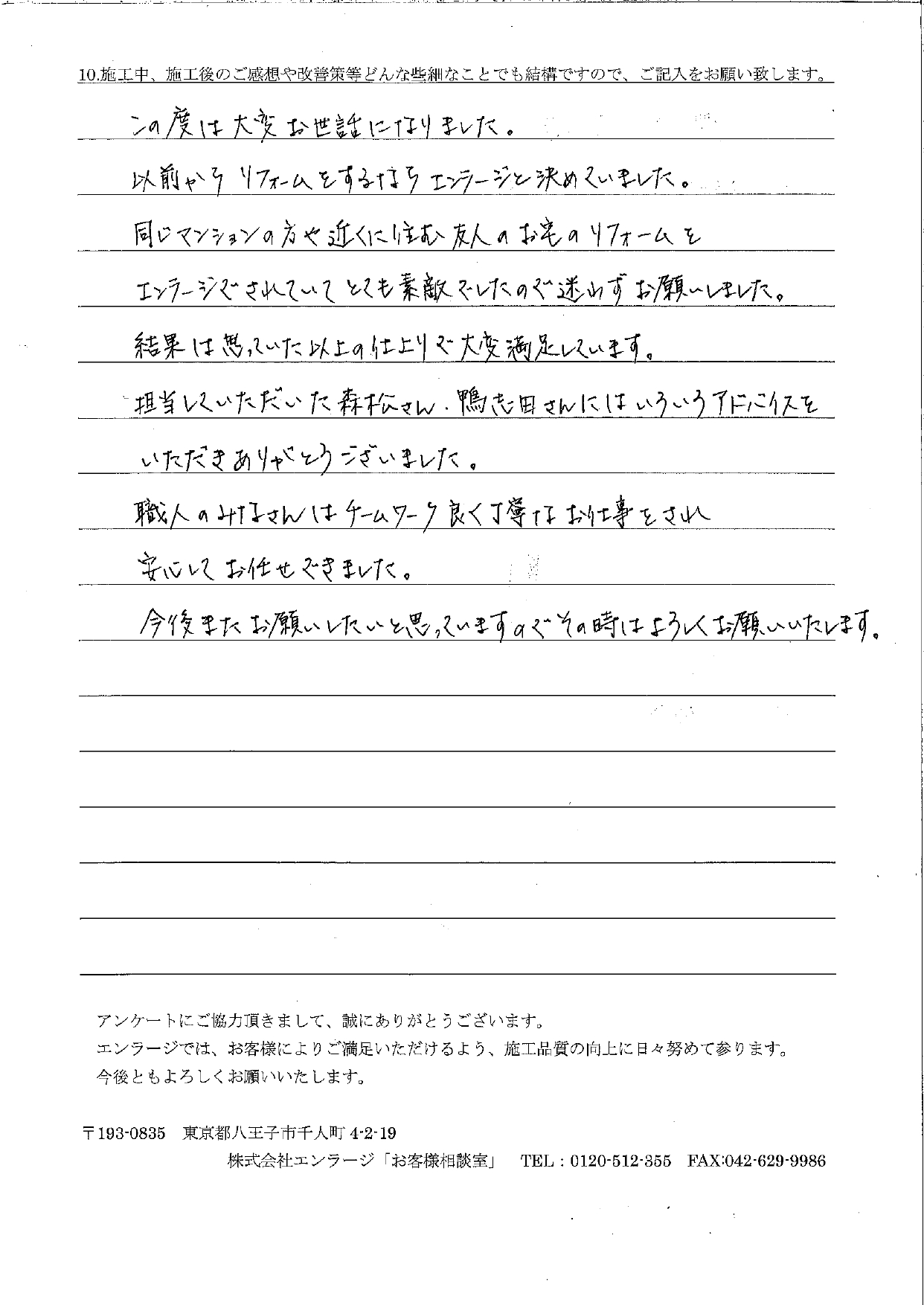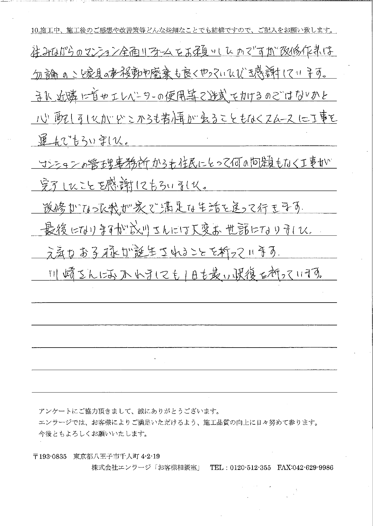 M様 この度はマンション全面リフォーム工事をお任せいただき誠にありがとうございました。ご在宅での工事でご負担もあったかと思いますがご配慮いただき、工事後もご満足いただけて大変嬉しく思います。また何かお困りごとなどありましたらいつでもご連絡くださいね。今後ともどうぞよろしくお願い申し上げます。 プランナー川崎