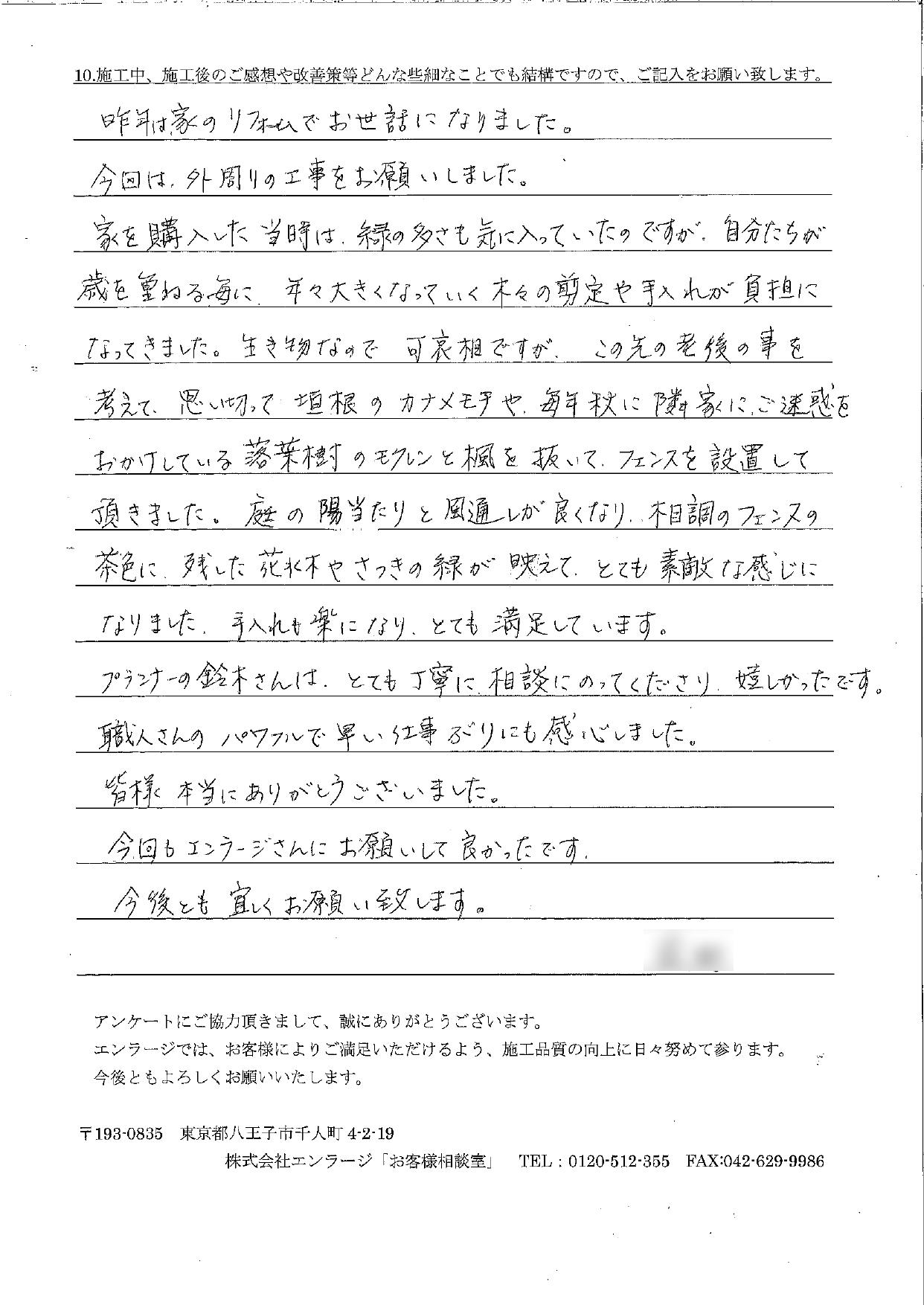 O様 昨年の室内のリフォームに続き、この度は外構工事をお任せいただき誠にありがとうございました。メンテナンスのしやすさを重視しながら、想い出の草木は残すご提案をさせていただきましたが、「満足しています」とのお言葉をいただけて大変うれしく思います。今後も何かお困りのことがありましたら、いつでもご連絡くださいね。今後ともどうぞ宜しくお願い致します。施工管理 村松