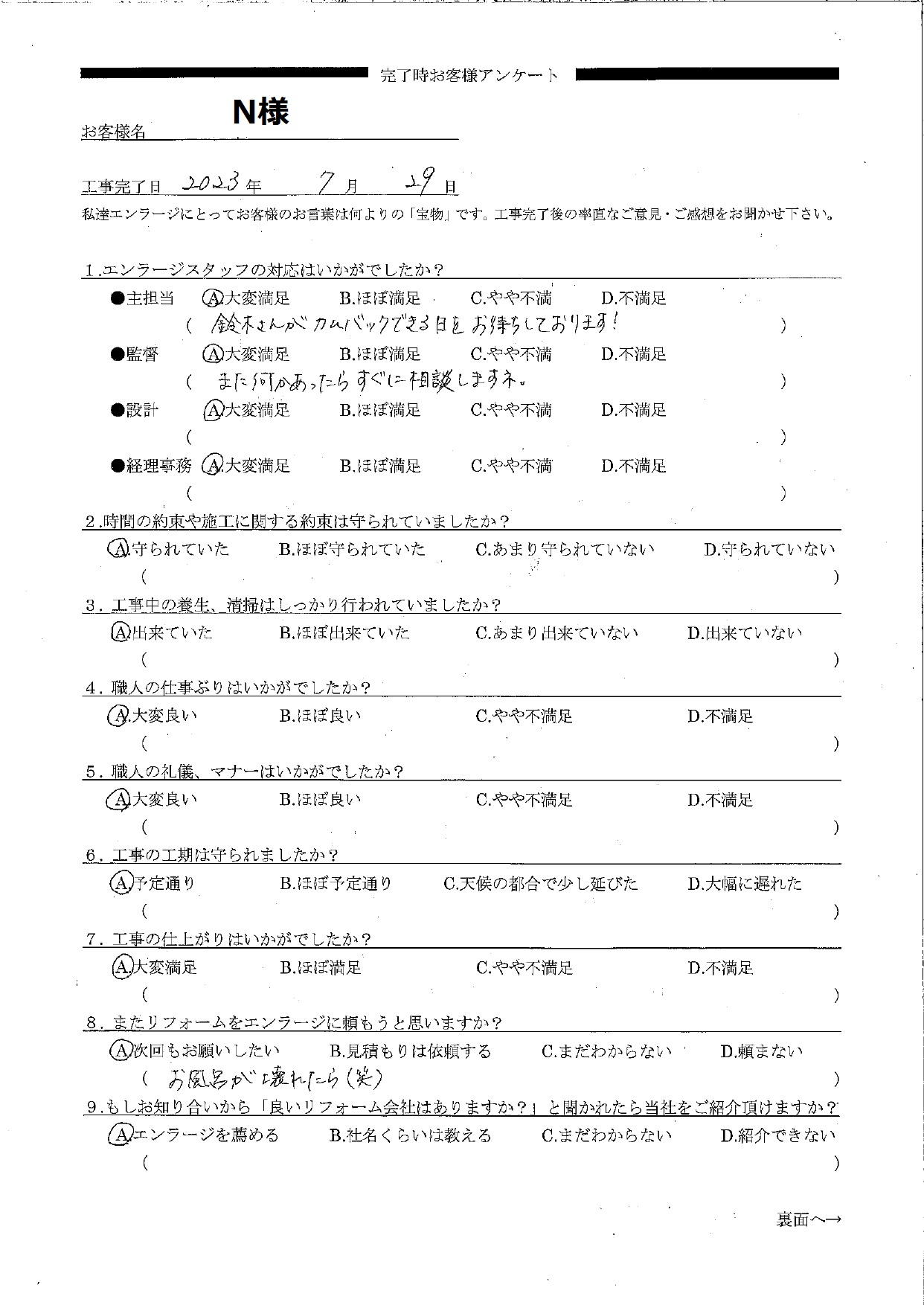N様 この度のリフォーム工事も迷いなく当社にお任せいただき、誠にありがとうございました。今回もご満足いただける結果となり、とても嬉しいです。N様からはいつも温かいお言葉をいただき、私たちの励みになっております。N様とお話していると、楽しくて毎回時間が足りません!お近くを通りがかりの際は、お気軽に当店にお立ち寄りくださいね。また沢山お話させていただきたいです♪今後とも宜しくお願い致します。 担当 更科