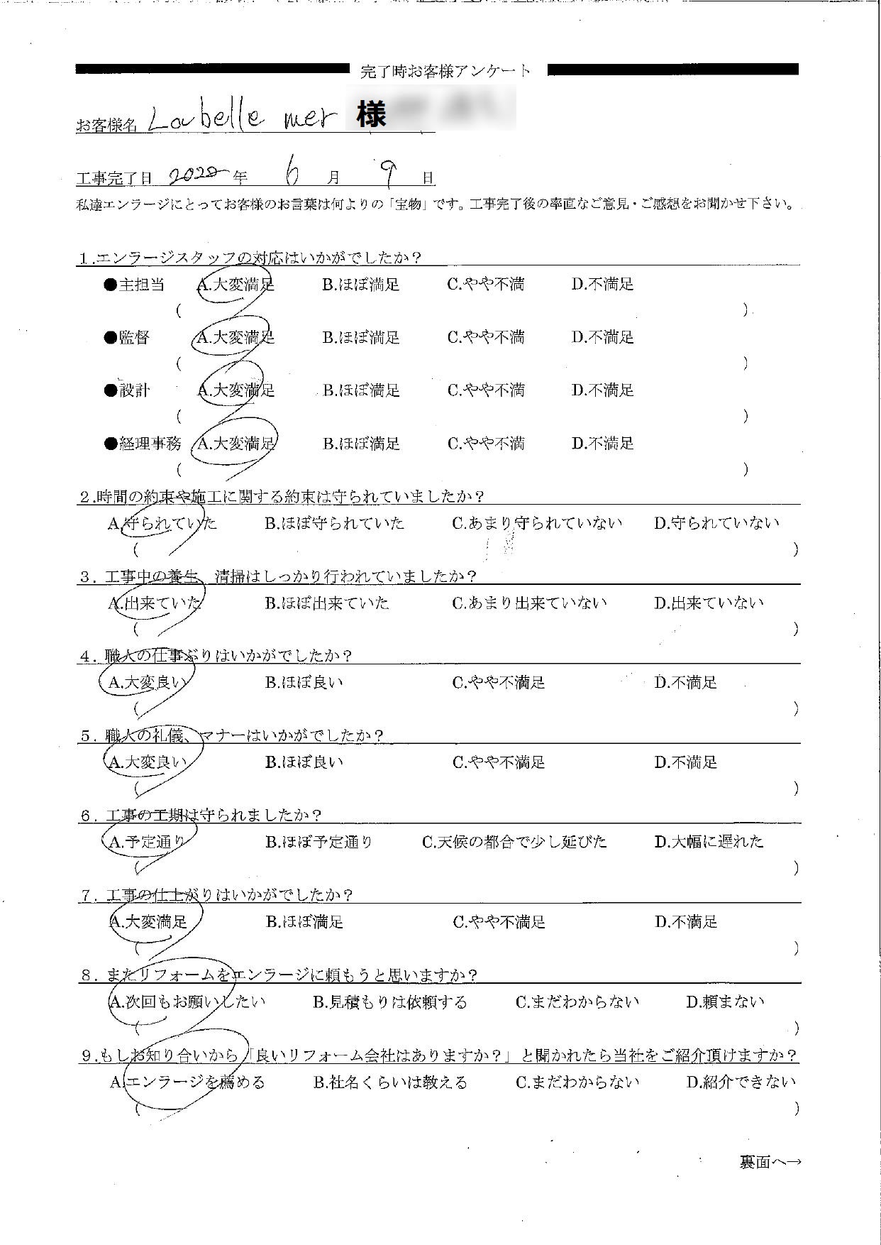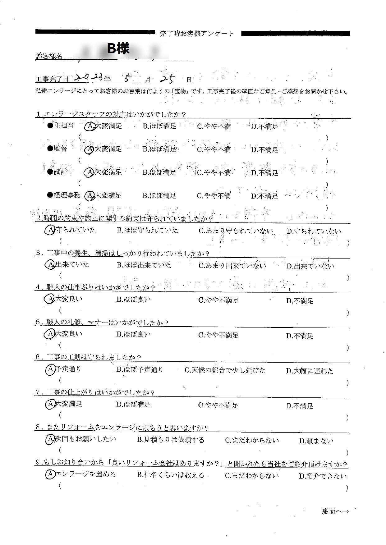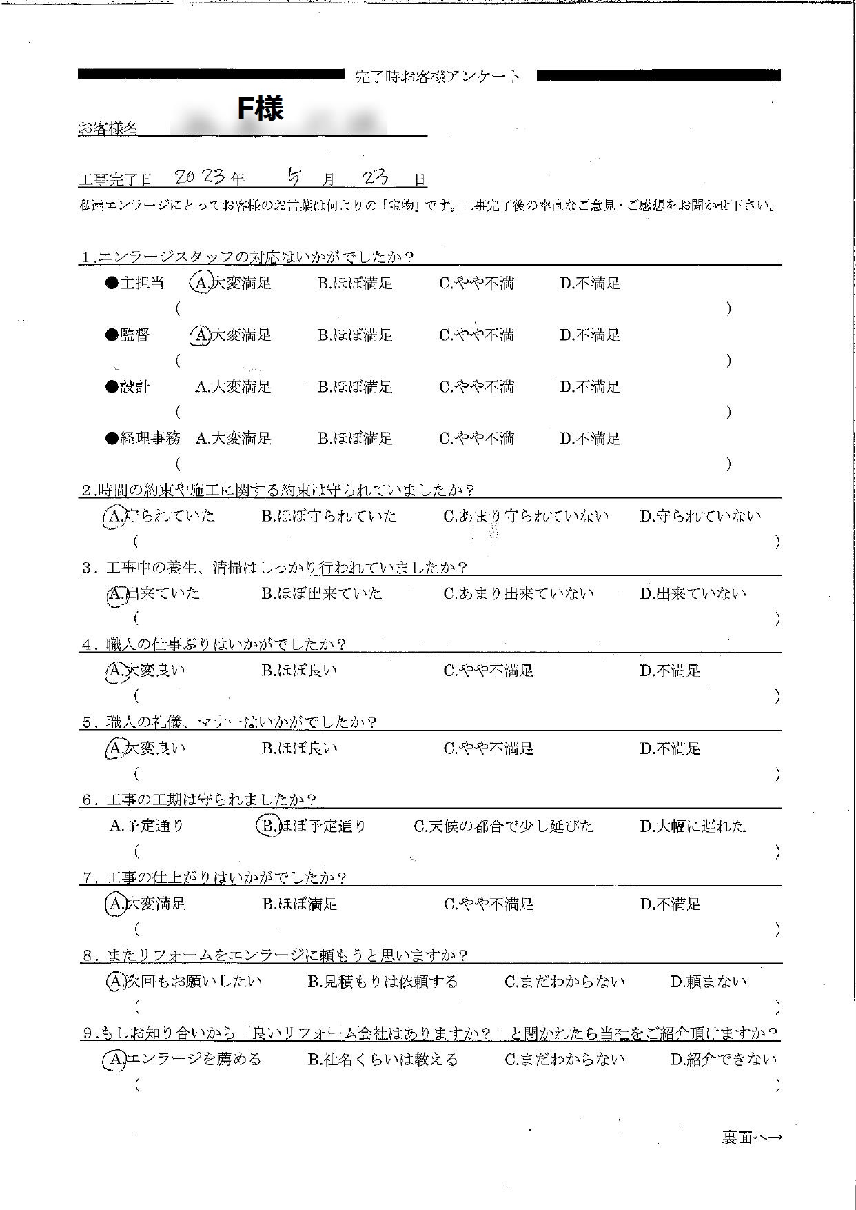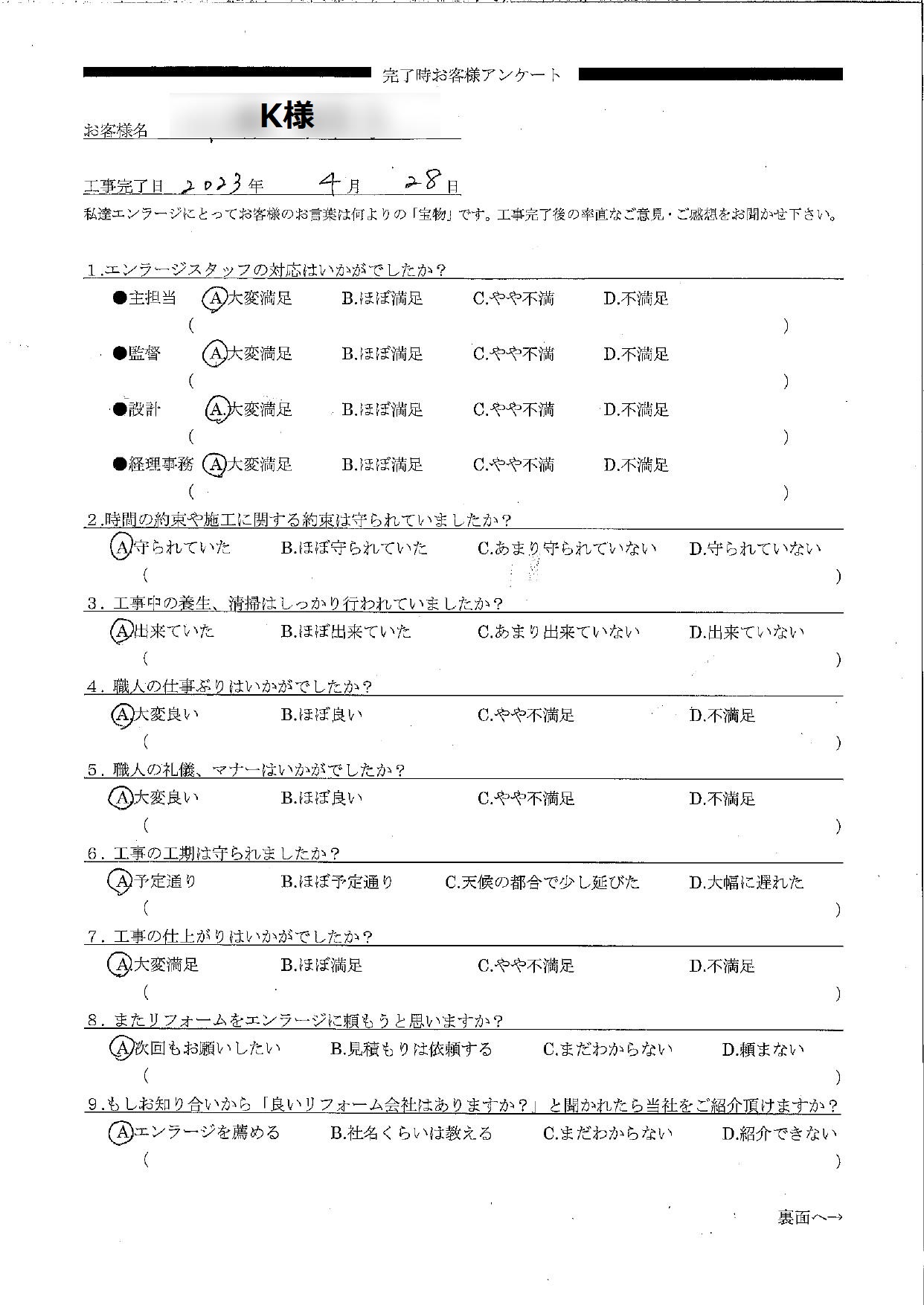 その結果、お客様アンケートでオールAという大変嬉しい評価と温かいお言葉を頂き、嬉しい気持ちでいっぱいです。生まれ変わったご自宅で過ごす時間が、より素敵で快適な時間になるよう心から願っております。今後とも末永いお付き合いをどうぞよろしくお願いいたします。チーフプランナー 鈴木