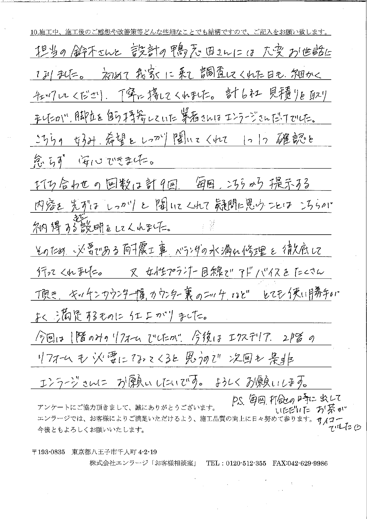 K様へ この度は1階の全面リフォーム・バルコニー防水等のトータルリフォームをお任せ頂きありがとうございました。K様はホームプロというサイトを見てアドバイザーさんに電話で相談したところ、当社を含む3社さんを紹介されたお客様でした。合い見積もりだったので、当社の強みが出るよう現地調査やヒアリング時に工夫を凝らしました。女性目線のご提案など当社ならではのプランを気に入って頂きとても嬉しかったです。私は設計と施工管理を担当させて頂きましたが、より良いお住まいになるよう全力を尽くさせて頂きました。日野支店は打合せ時の美味しいお飲み物も自慢ですので、またお茶だけでも飲みにいらして下さい。今後とも宜しくお願い致します。 設計・施工管理 鴨志田