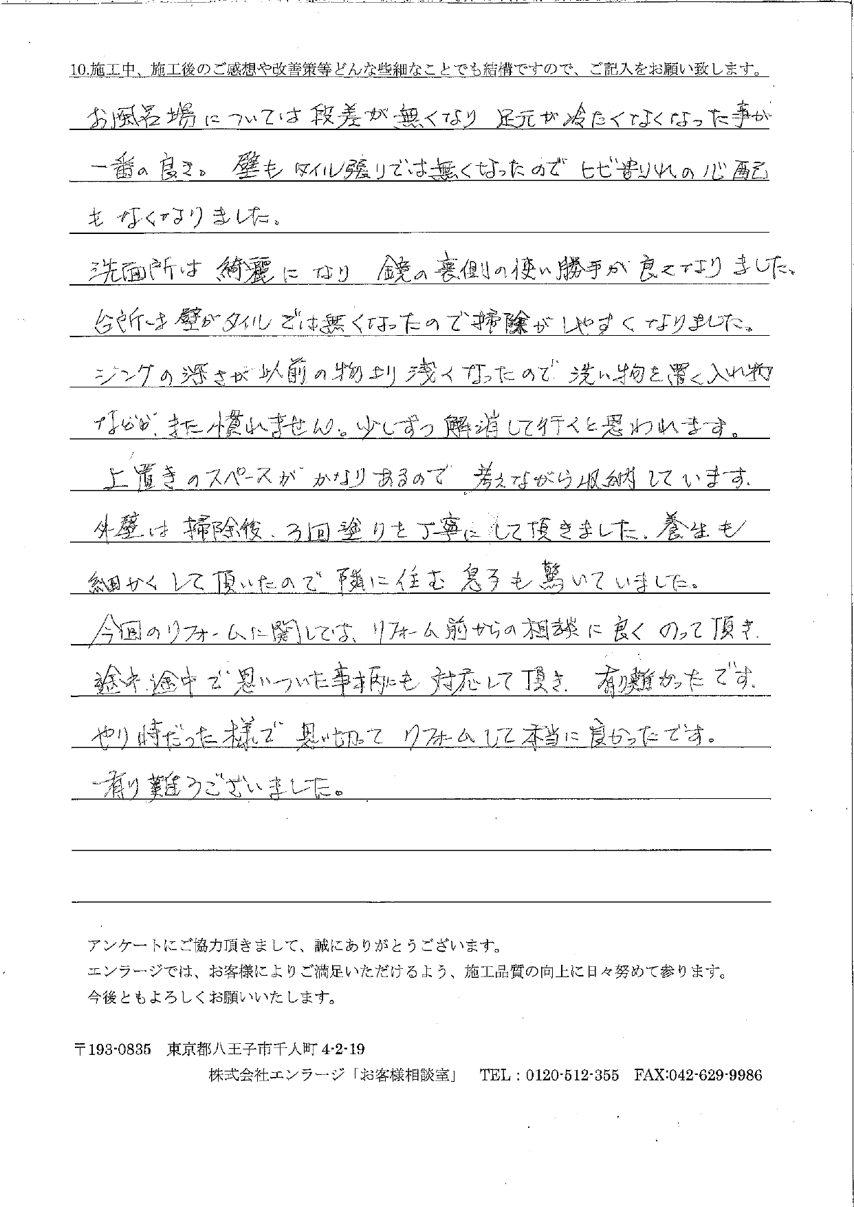 「思い切ってリフォームして良かった」とおっしゃていただけて大変嬉しく思います。今後とも末永いお付き合いをよろしくお願い申し上げます。日野支店店長 宇津木